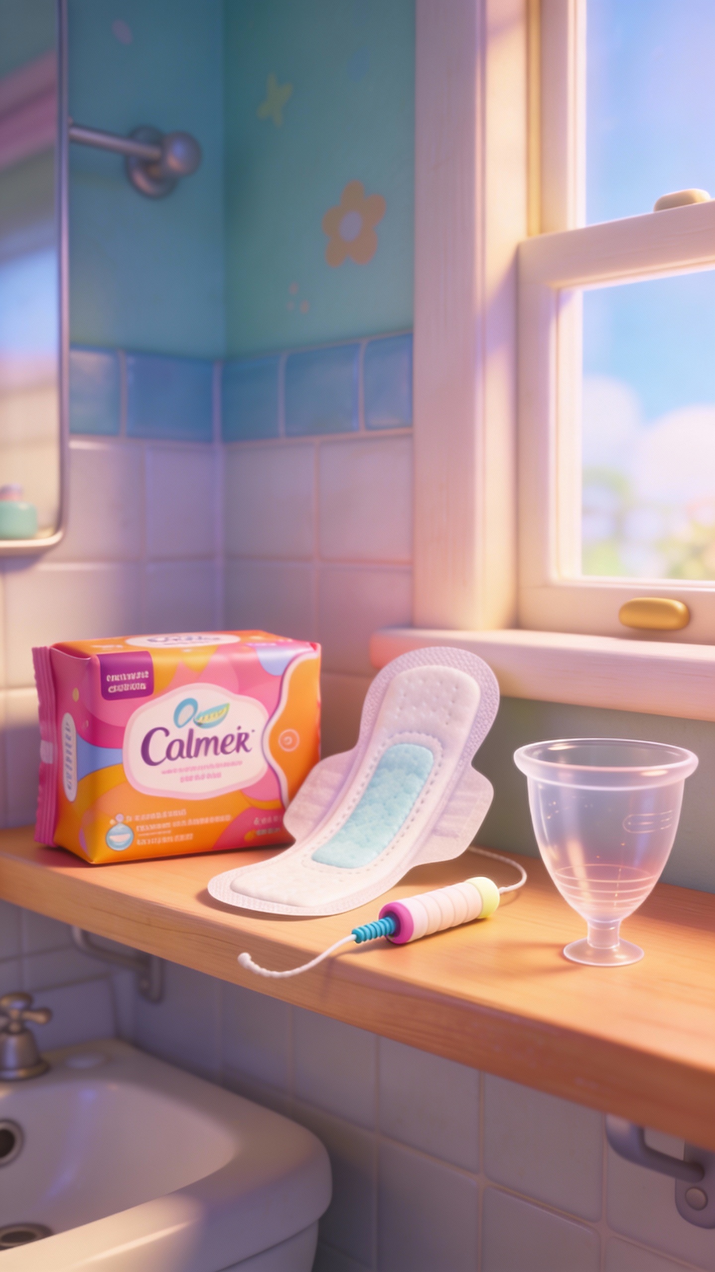 Уютная ванная комната с ярким дневным светом через окно, на полке стоят прокладка в яркой упаковке, тампон с аппликатором и менструальная чаша из прозрачного силикона, мягкие пастельные тона, слегка мультяшный стиль, камера в уровне глаз. 3D animated style inspired by Pixar movies with vibrant colors, smooth textures, and expressive characters