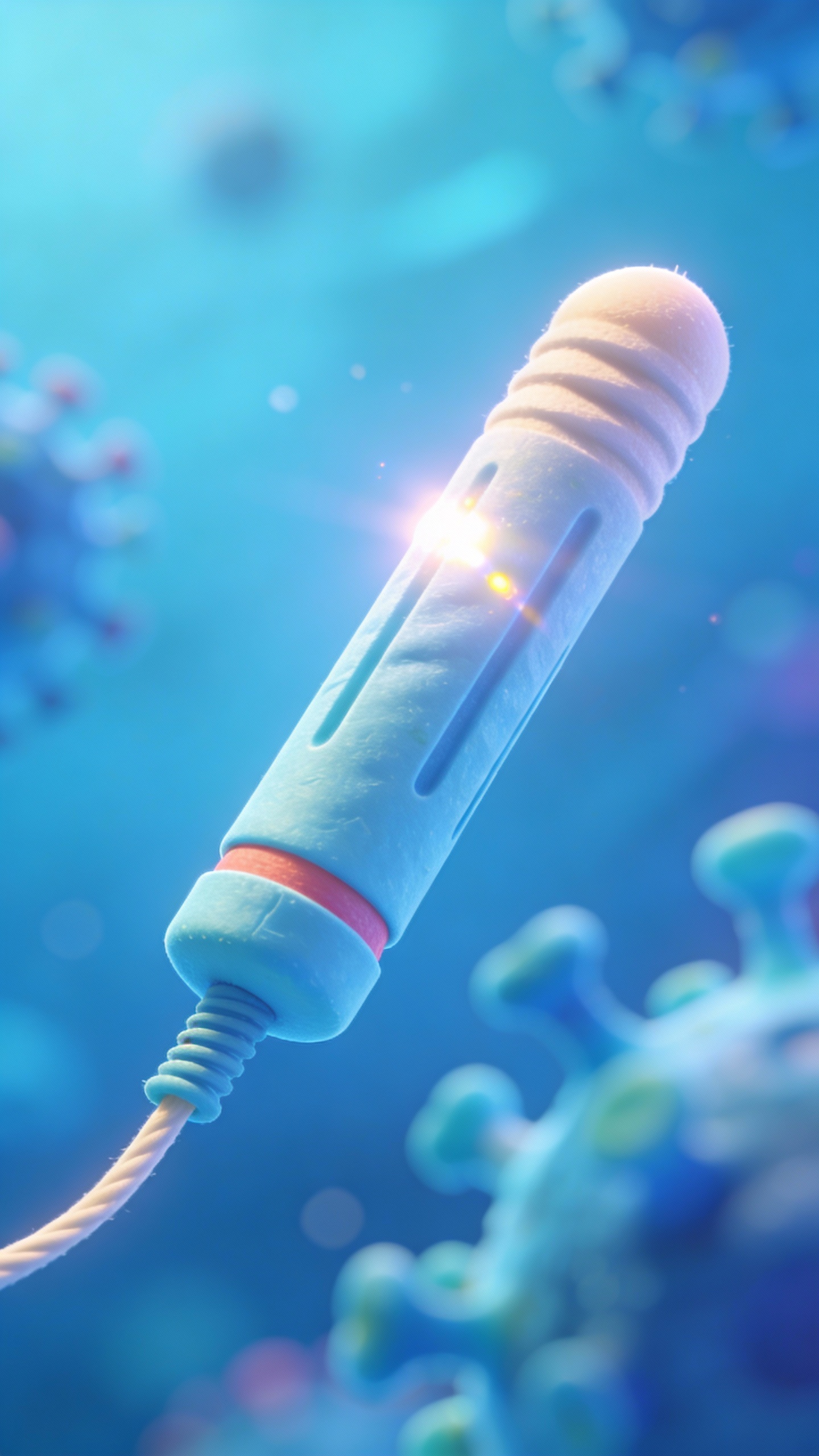 Крупный план на тампон, фон слегка размытый, холодные и чистые голубые тона, световые блики на аппликаторе, камера немного ниже смотрит вверх. 3D animated style inspired by Pixar movies with vibrant colors, smooth textures, and expressive characters