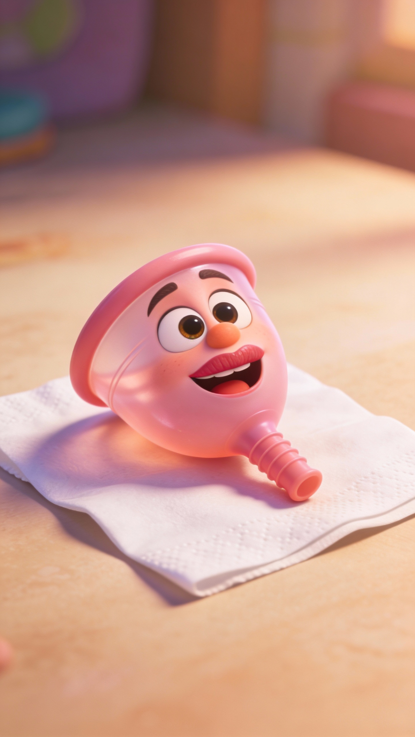 Средний план на менструальную чашу на белой салфетке, теплые нейтральные тона, мягкая подсветка, камера кругом обходит чаша мультяшная но как она живая, есть глаза губы нос и рот. 3D animated style inspired by Pixar movies with vibrant colors, smooth textures, and expressive characters