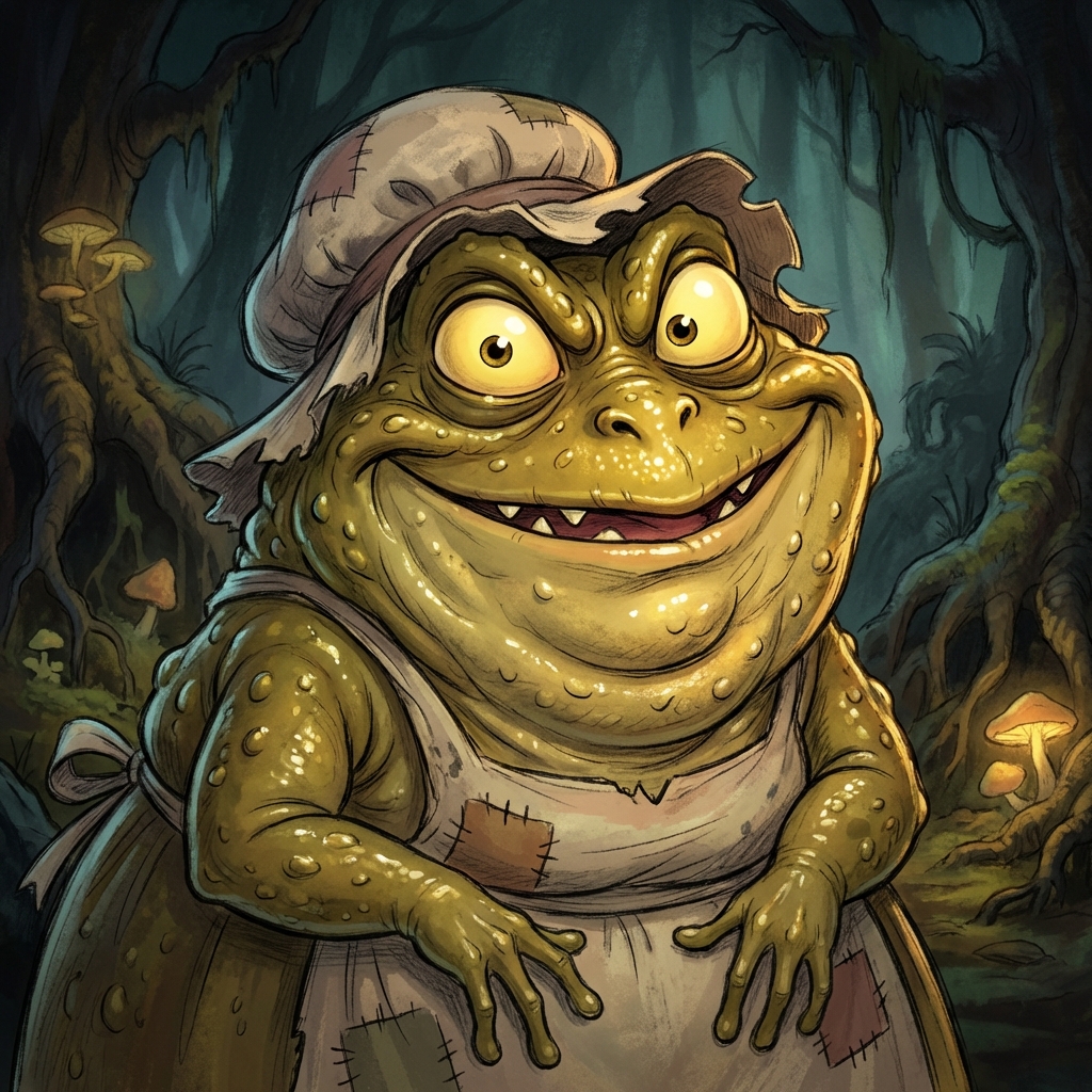 Portrait of Portrait of an ugly fat green toad mother with warts, bulging eyes, wide sly mouth, slimy skin, cartoonish Disney style, menacing grin.. High quality character portrait, detailed face, professional lighting.