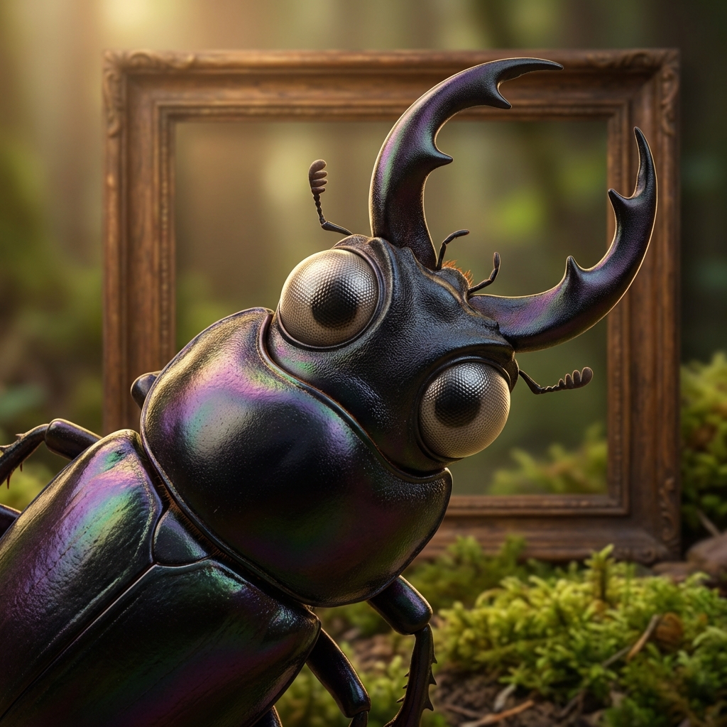 Portrait of Portrait of a large shiny black beetle with prominent mandibles, compound eyes, iridescent shell, realistic insect cartoon style, curious expression.. High quality character portrait, detailed face, professional lighting.