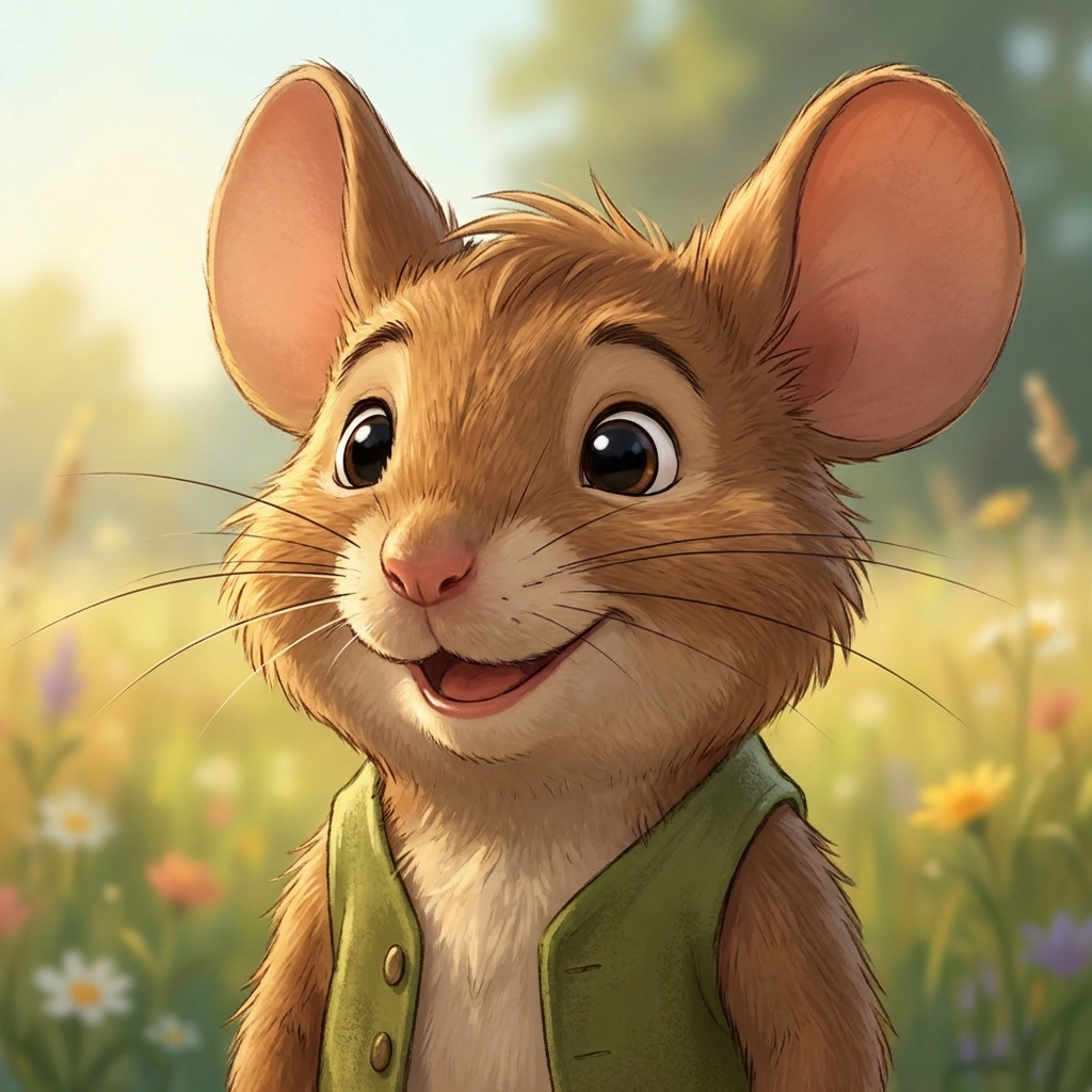 Portrait of Portrait of a cute brown field mouse with large ears, whiskers, friendly black eyes, soft fur, warm welcoming smile, Disney animation style.. High quality character portrait, detailed face, professional lighting.