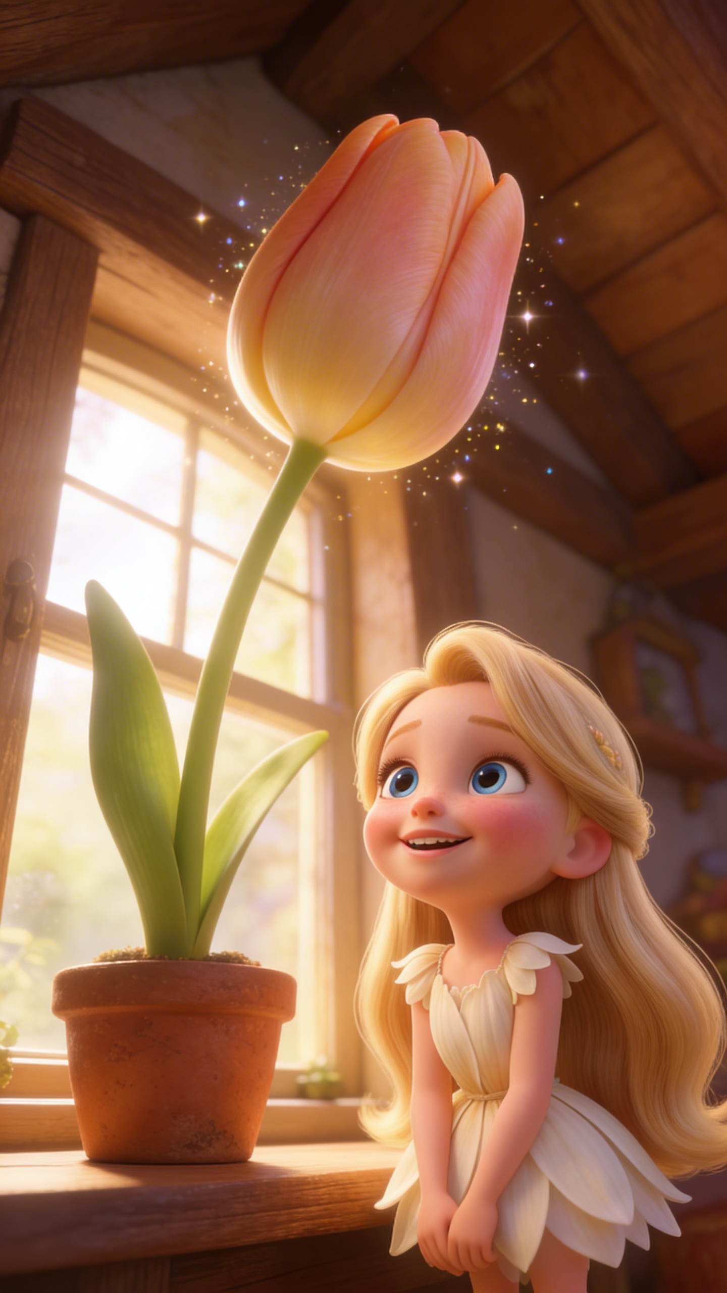3D Pixar style. Vertical 9:16 portrait format, cozy wooden cottage interior, large tulip flower in clay pot on windowsill table, petals tightly closed, warm morning sunlight filtering through window, soft magical sparkles around flower, low angle shot looking up at the towering bloom. Character appearance reference (MUST match exactly): - Дюймовочка: Portrait of Thumbelina, a delicate tiny girl the size of a thumb with long flowing blonde hair, big blue eyes, rosy cheeks, wearing a white petal dress, innocent joyful expression, soft glow, highly detailed Pixar-style animation, close-up face.