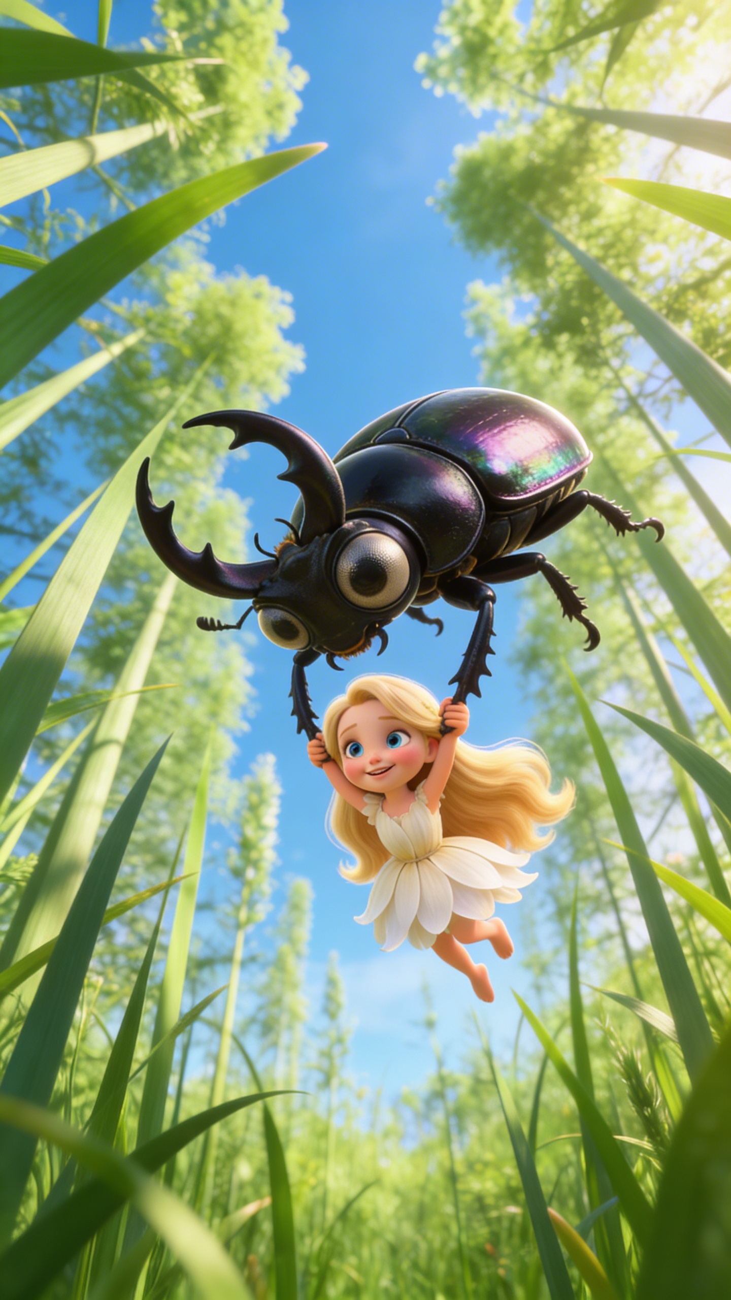 3D Pixar style. Vertical 9:16 summer meadow, tall grass blades towering like trees, large beetle hovering mid-air grasping tiny figure, blue sky above, vibrant green tones, dynamic low angle upward shot. Character appearance reference (MUST match exactly): - Дюймовочка: Portrait of Thumbelina, a delicate tiny girl the size of a thumb with long flowing blonde hair, big blue eyes, rosy cheeks, wearing a white petal dress, innocent joyful expression, soft glow, highly detailed Pixar-style animation, close-up face. - Жук: Portrait of a large shiny black beetle with prominent mandibles, compound eyes, iridescent shell, realistic insect cartoon style, curious expression.