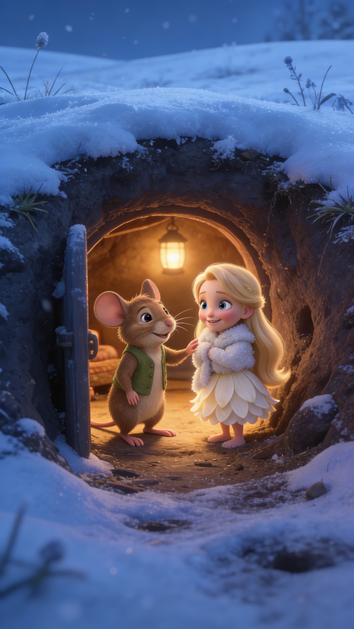 3D Pixar style. Vertical 9:16 underground mouse burrow entrance in snowy field, cozy warm interior visible, mouse welcoming tiny shivering girl, soft lantern light, contrast cold blue outside. Character appearance reference (MUST match exactly): - Дюймовочка: Portrait of Thumbelina, a delicate tiny girl the size of a thumb with long flowing blonde hair, big blue eyes, rosy cheeks, wearing a white petal dress, innocent joyful expression, soft glow, highly detailed Pixar-style animation, close-up face. - Мышь: Portrait of a cute brown field mouse with large ears, whiskers, friendly black eyes, soft fur, warm welcoming smile, Disney animation style.