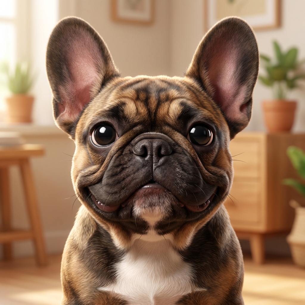 3D Pixar style. Portrait of Adorable young French Bulldog portrait, compact stocky build, oversized bat-like ears standing tall, expressive round black eyes full of emotion, wrinkled velvety face, short glossy brindle coat with white chest patch, playful mischievous vibe, loose jowls, highly detailed realistic rendering, warm soft lighting on fur texture.. High quality character portrait, detailed face, professional lighting.