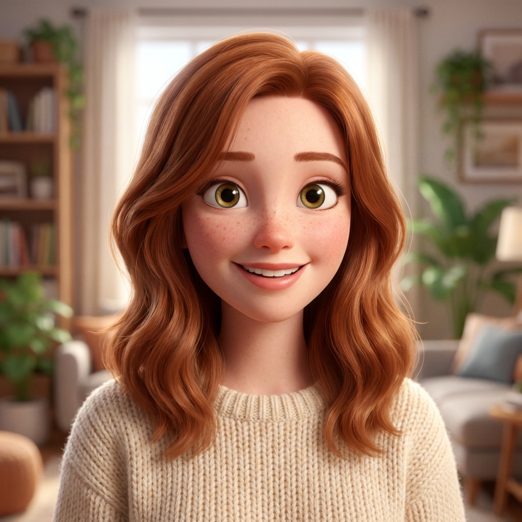 3D Pixar style. Portrait of Warm smiling young woman portrait, mid-20s, gentle oval face, bright hazel eyes sparkling with kindness, soft wavy auburn hair to shoulders, fair skin with freckles, casual cozy sweater, nurturing joyful energy, natural makeup, highly detailed realistic style, soft diffused natural light.. High quality character portrait, detailed face, professional lighting.