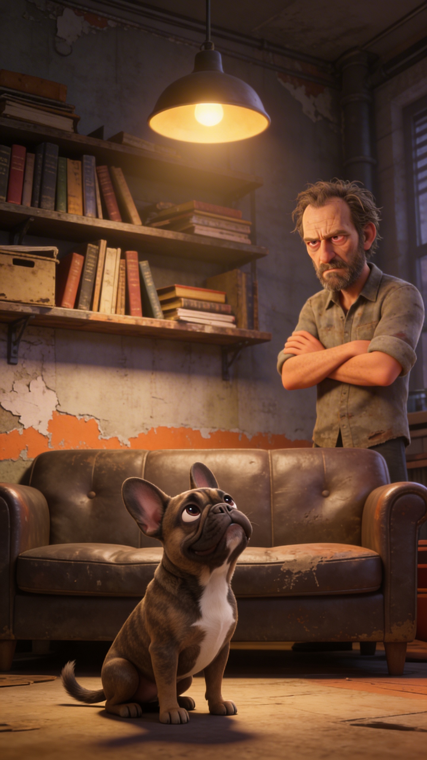 3D Pixar style. Cozy urban apartment living room with cluttered shelves of old books, faded wallpaper peeling at edges, worn leather couch under a hanging lamp. Medium wide shot from eye level centered on the couch area. Dim warm incandescent bulb light from overhead fixture casting soft yellow glow and long shadows. Mood is mundane domestic comfort turning tense. The French Bulldog character sits obediently on the floor gazing up expectantly, tail wagging slowly; the Злой хозяин character stands nearby arms crossed with stern expression. Muted grays and browns with subtle orange accents, cinematic realistic style. Character appearance reference (MUST match exactly): - Булли: Adorable young French Bulldog portrait, compact stocky build, oversized bat-like ears standing tall, expressive round black eyes full of emotion, wrinkled velvety face, short glossy brindle coat with white chest patch, playful mischievous vibe, loose jowls, highly detailed realistic rendering, warm soft lighting on fur texture. - Злой хозяин: Middle-aged man portrait, rugged unkempt face with stubble beard, deep frown lines, bloodshot tired eyes glaring angrily, receding messy brown hair, sallow skin, wearing faded casual shirt, overall vibe of frustration and neglect, photorealistic, dramatic side lighting casting harsh shadows.