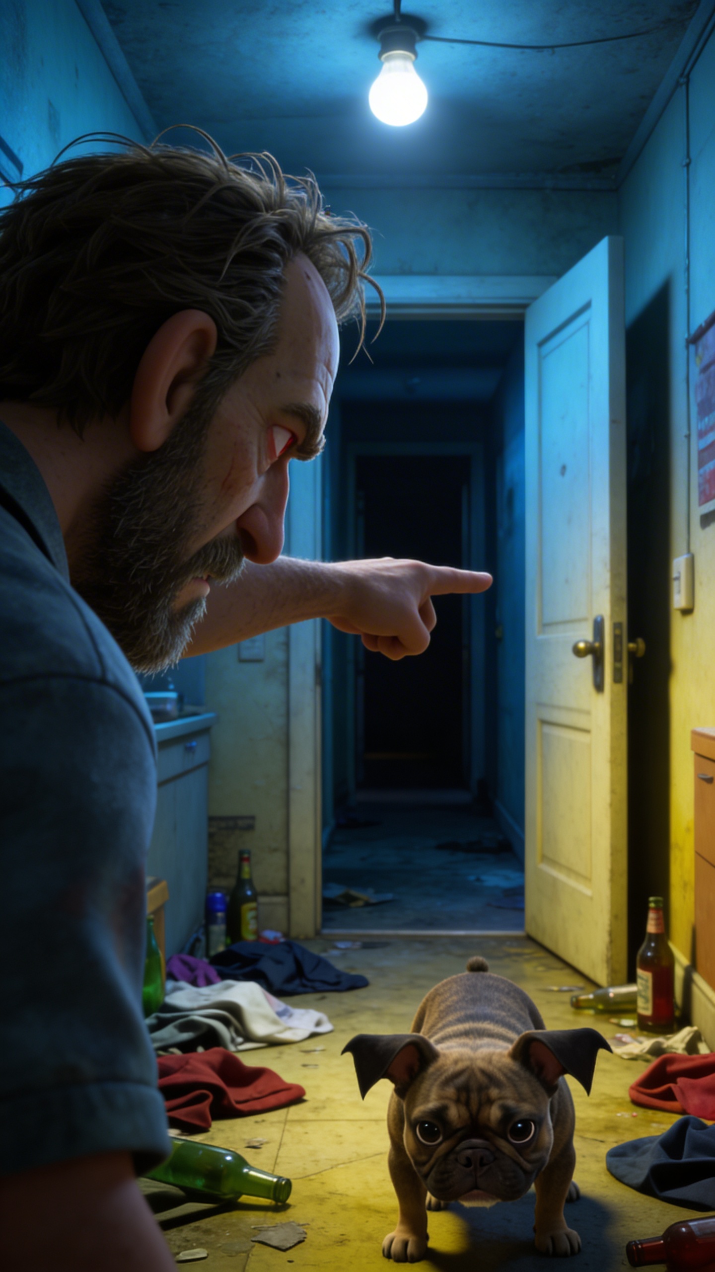 3D Pixar style. Same cramped apartment interior now chaotic with scattered clothes and empty bottles on floor, open door revealing dark hallway beyond. Tight over-the-shoulder shot from behind the Злой хозяин character looking down. Harsh overhead light from bare bulb creating stark contrasts and deep shadows on faces. Tense and ominous atmosphere. The Злой хозяин character points aggressively at door with furrowed brow; French Bulldog character cowers low with ears back. Cool blue tones mixed with sickly yellows, gritty realistic style. Character appearance reference (MUST match exactly): - Булли: Adorable young French Bulldog portrait, compact stocky build, oversized bat-like ears standing tall, expressive round black eyes full of emotion, wrinkled velvety face, short glossy brindle coat with white chest patch, playful mischievous vibe, loose jowls, highly detailed realistic rendering, warm soft lighting on fur texture. - Злой хозяин: Middle-aged man portrait, rugged unkempt face with stubble beard, deep frown lines, bloodshot tired eyes glaring angrily, receding messy brown hair, sallow skin, wearing faded casual shirt, overall vibe of frustration and neglect, photorealistic, dramatic side lighting casting harsh shadows.