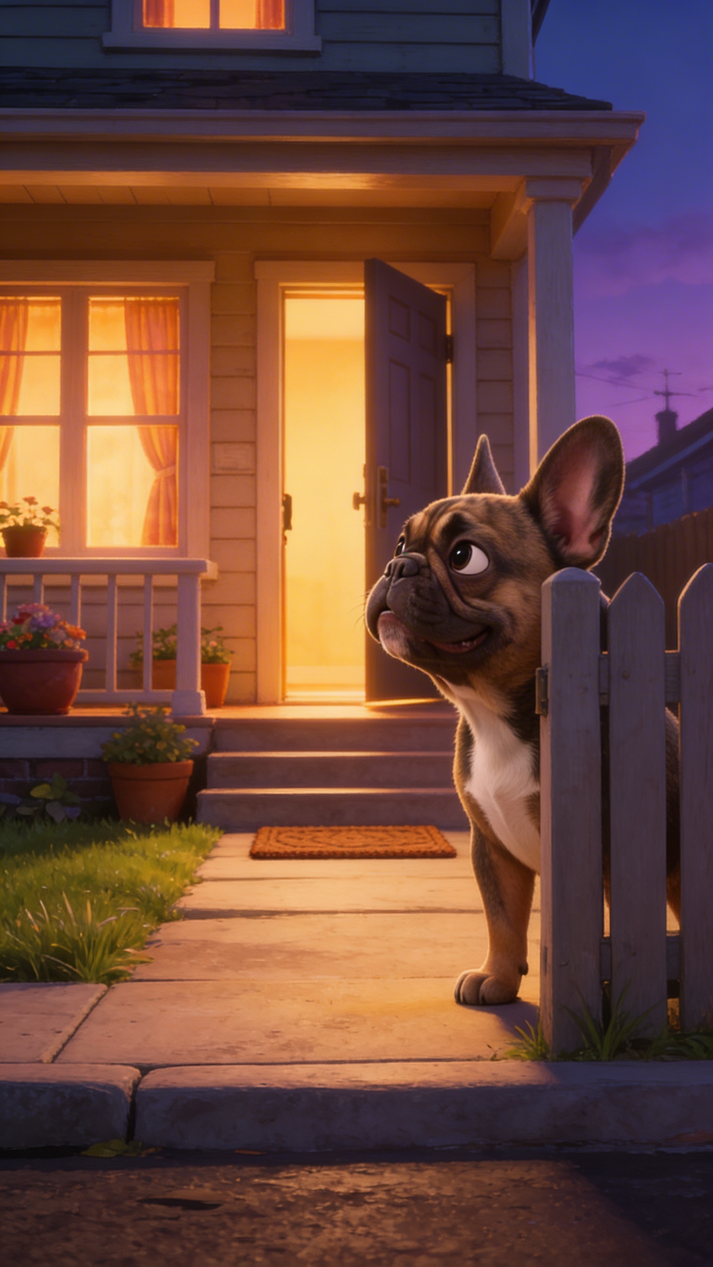 3D Pixar style. Suburban house porch at dusk, glowing warm windows with curtains drawn, flower pots and welcome mat, soft lawn leading up steps. Medium shot from street level eye height. Golden warm interior light spilling out door cracked open, twilight purple sky fading. Hopeful inviting atmosphere. French Bulldog character pauses at fence peeking curiously toward light. Rich ambers yellows against deep blues, painterly cinematic style. Character appearance reference (MUST match exactly): - Булли: Adorable young French Bulldog portrait, compact stocky build, oversized bat-like ears standing tall, expressive round black eyes full of emotion, wrinkled velvety face, short glossy brindle coat with white chest patch, playful mischievous vibe, loose jowls, highly detailed realistic rendering, warm soft lighting on fur texture.
