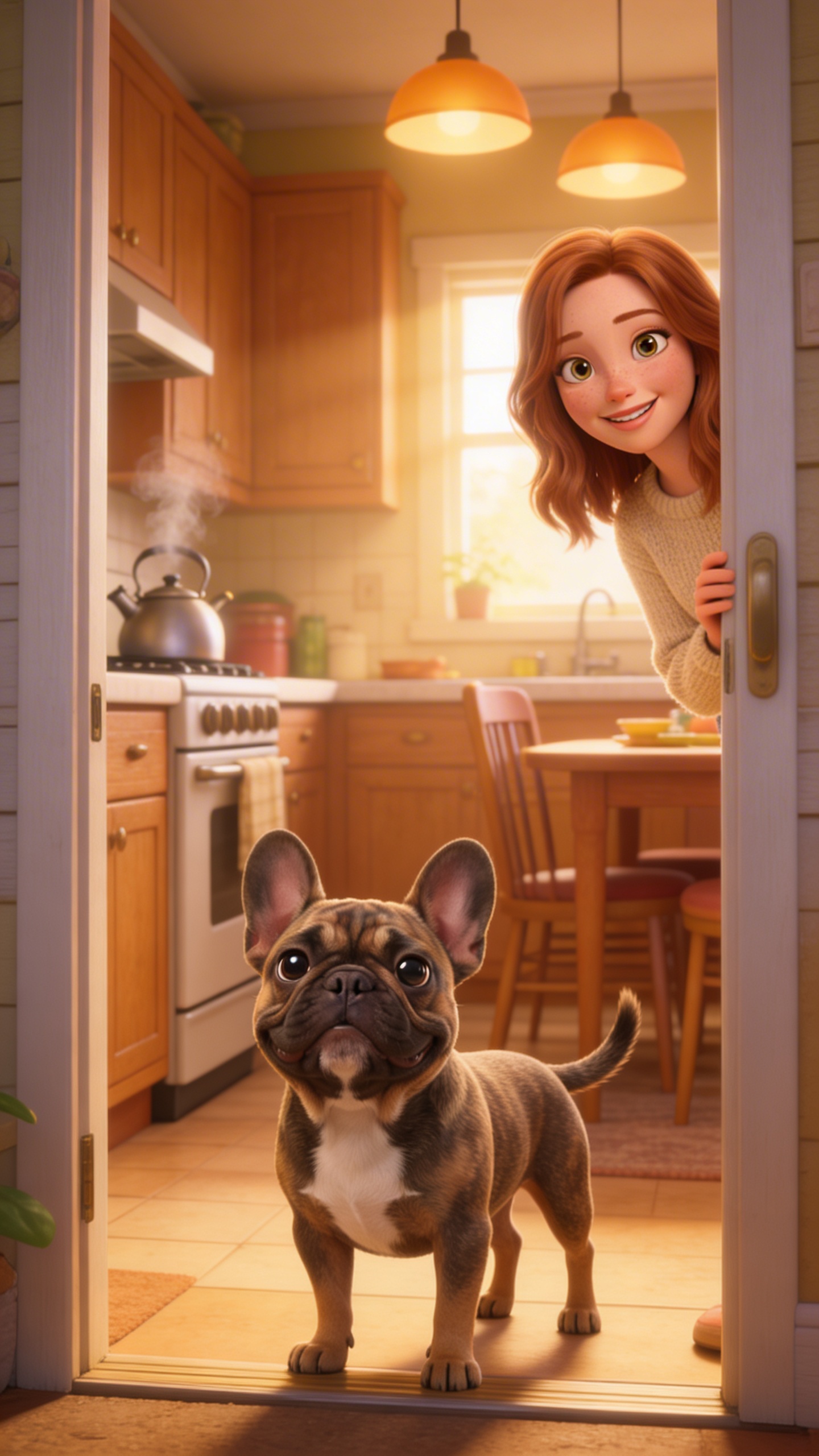3D Pixar style. Bright cozy kitchen inside suburban home, wooden cabinets, steaming teapot on stove, family table with chairs. Over-the-shoulder medium shot from doorway inward. Soft warm overhead pendant lights and window backlight creating inviting glow. Surprised compassionate mood. Новая мама character leans out door smiling warmly; French Bulldog character stands at threshold tail wagging tentatively. Vibrant earth tones with golden highlights, homely realistic detail. Character appearance reference (MUST match exactly): - Булли: Adorable young French Bulldog portrait, compact stocky build, oversized bat-like ears standing tall, expressive round black eyes full of emotion, wrinkled velvety face, short glossy brindle coat with white chest patch, playful mischievous vibe, loose jowls, highly detailed realistic rendering, warm soft lighting on fur texture. - Новая мама: Warm smiling young woman portrait, mid-20s, gentle oval face, bright hazel eyes sparkling with kindness, soft wavy auburn hair to shoulders, fair skin with freckles, casual cozy sweater, nurturing joyful energy, natural makeup, highly detailed realistic style, soft diffused natural light.
