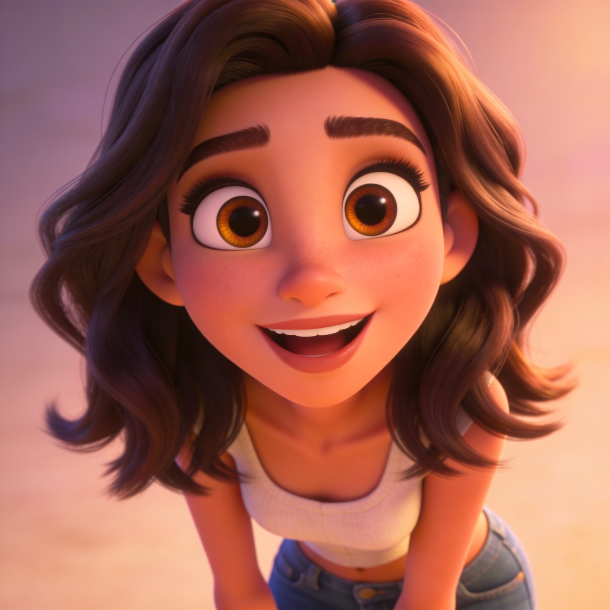 3D Pixar style. Portrait of Девушка 22 лет в стиле Pixar-анимации: большие выразительные глаза с огромными радужками, идеальная гладкая кожа, пухлые губы, длинные волнистые волосы до плеч, стройная фигура, одета в легкий топ и джинсы, мимика гиперэмоциональная с активными бровями и улыбкой, полная энергии и удивления, дерзкий игривый взгляд.. High quality character portrait, detailed face, professional lighting.