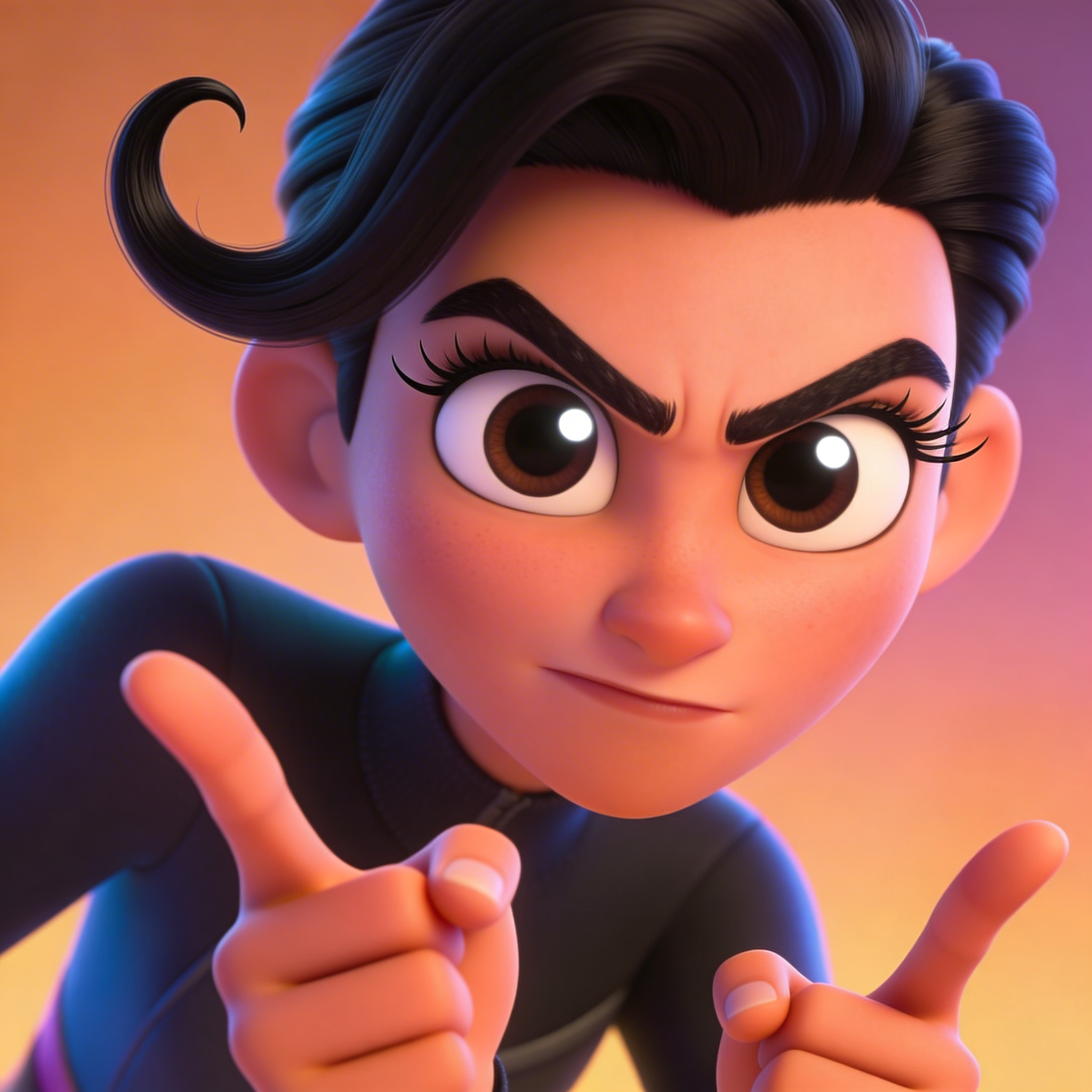 3D Pixar style. Portrait of Антропоморфная ресница в стиле Pixar: длинная изогнутая черная волосинка-туловище длиной 2 см, огромные круглые глаза с белыми бликами, маленькие ручки с пальчиками, строгий уверенный взгляд, густые брови, мимика строгая и авторитетная, энергичная жестикуляция, дерзкий юморный характер, 25-летний вид.. High quality character portrait, detailed face, professional lighting.