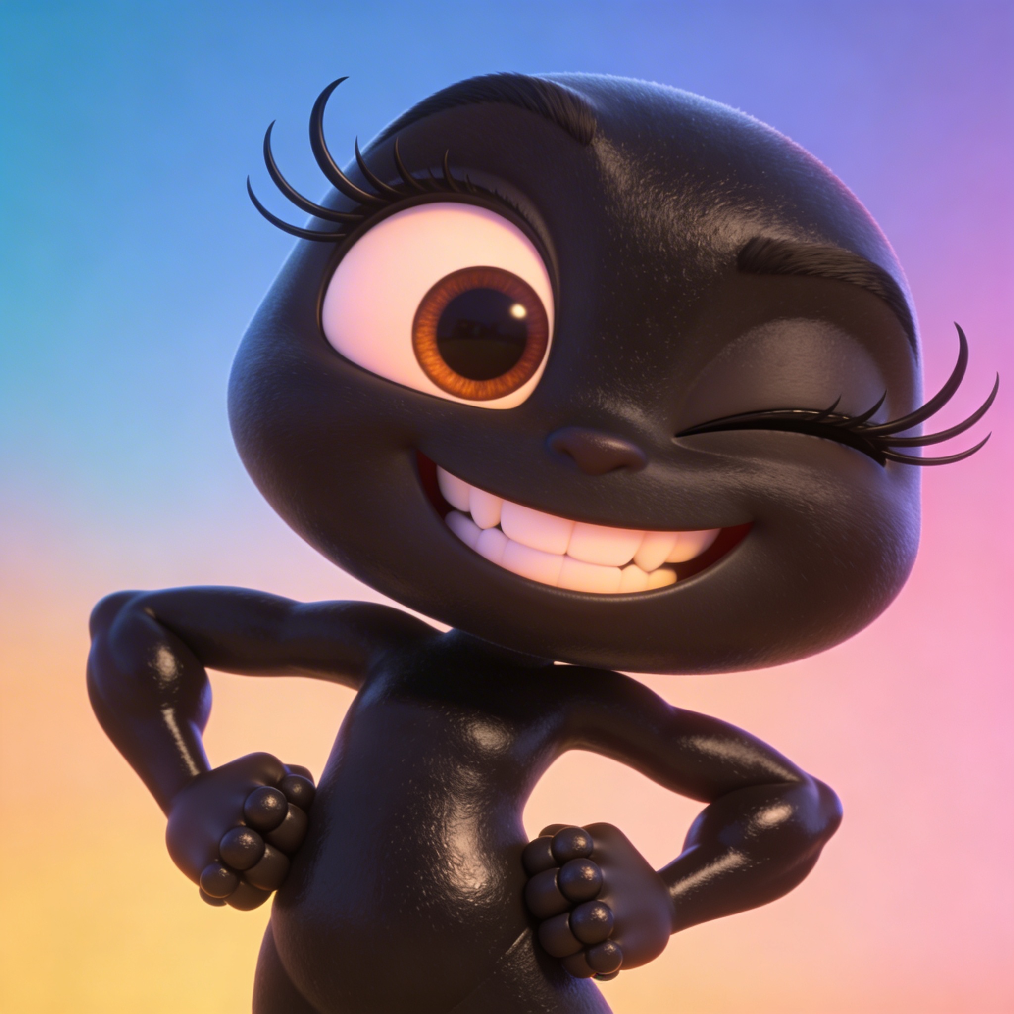 3D Pixar style. Portrait of Антропоморфная длинная изогнутая ресница в 3D-анимации Pixar, огромные круглые глаза с ехидным прищуром, широкая ухмылка с зубками, крошечные мускулистые ручки с кулачками, чёрная с глянцевым блеском, дерзкая поза 'руки в боки', гиперэмоциональная, яркие контрастные цвета.. High quality character portrait, detailed face, professional lighting.
