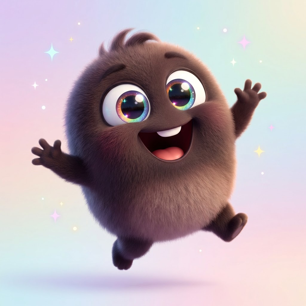 3D Pixar style. Portrait of Кудрявая пушистая ресница Pixar-style, гигантские блестящие глаза с радужными бликами, восторженная открытая улыбка, махающие ручки в жестах радости, тёмно-коричневая с мягким градиентом, игривая поза прыжка, сверхвыразительная мимика, пастельные тона с искрами.. High quality character portrait, detailed face, professional lighting.