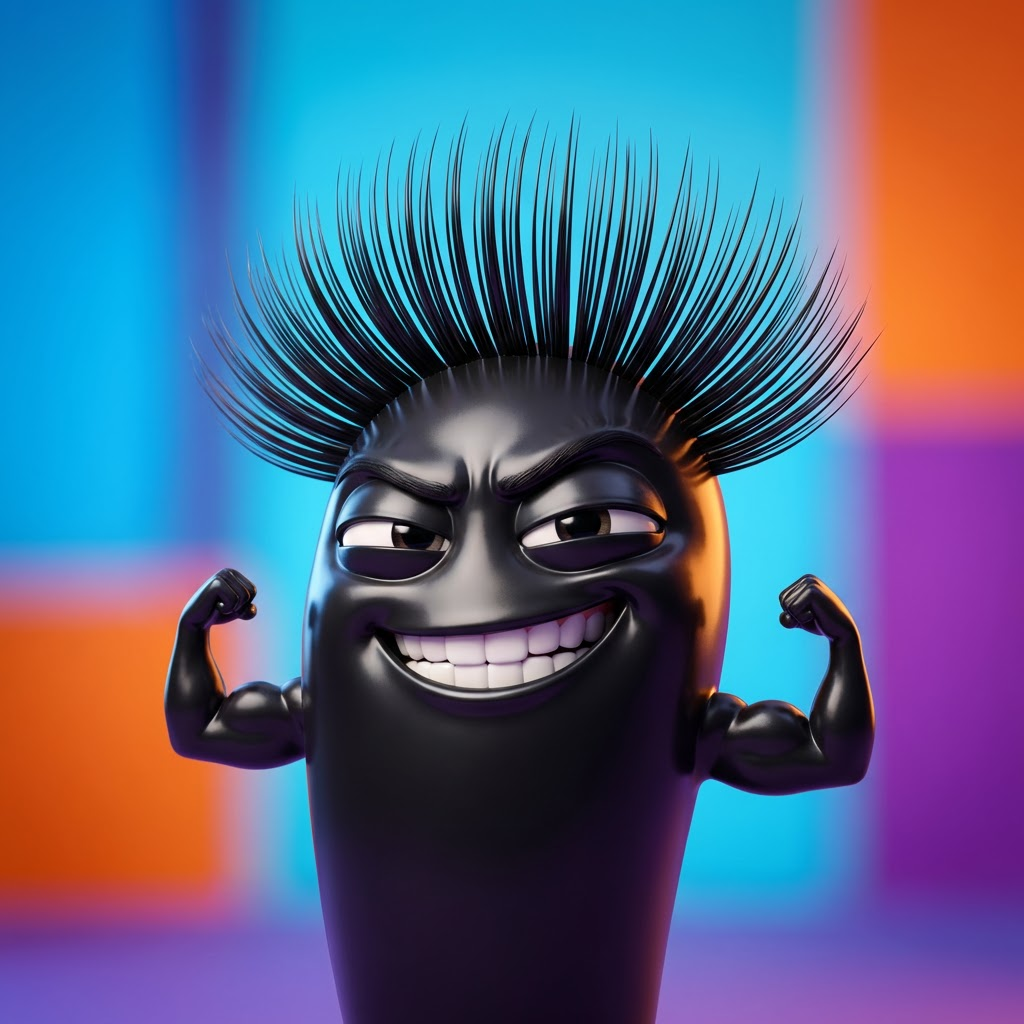 3D Pixar style. Portrait of Антропоморфная длинная изогнутая ресница в 3D-анимации Pixar, огромные круглые глаза с ехидным прищуром, широкая ухмылка с зубками, крошечные мускулистые ручки с кулачками, чёрная с глянцевым блеском, дерзкая поза 'руки в боки', гиперэмоциональная, яркие контрастные цвета.. High quality character portrait, detailed face, professional lighting.