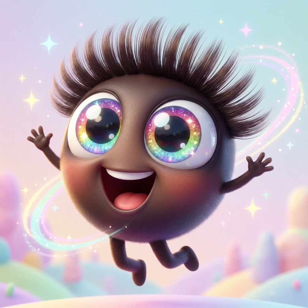 3D Pixar style. Ресница Pixar-style, гигантские блестящие глаза с радужными бликами, восторженная открытая улыбка, махающие ручки в жестах радости, тёмно-коричневая с мягким градиентом, игривая поза прыжка, сверхвыразительная мимика, пастельные тона с искрами.. High quality character portrait, detailed face, professional lighting.