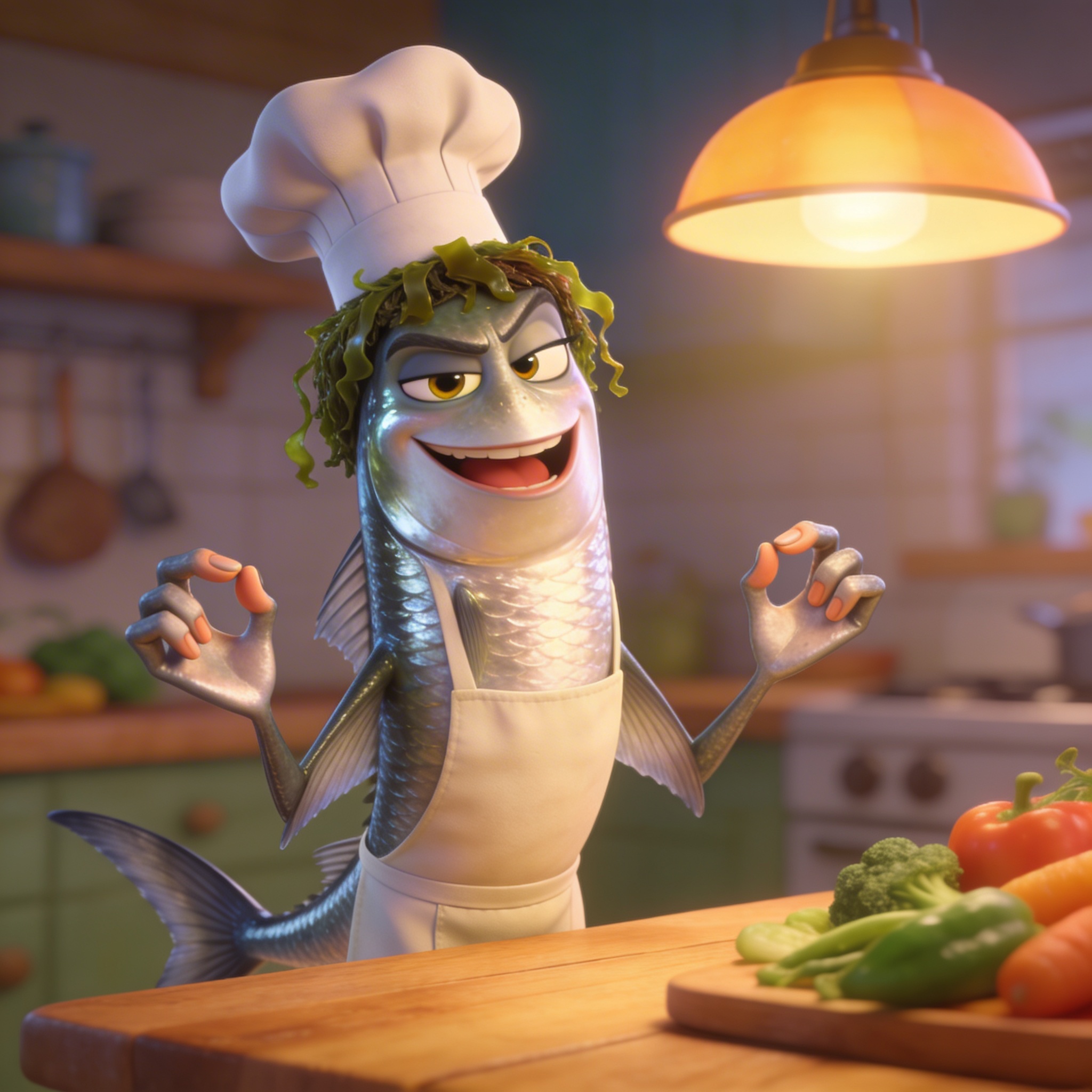 Антропоморфная сельдь в стиле Pixar, 3D-рендер, высокая детализация, милая и выразительная. Возраст около 30 лет, стройное рыбье тело с серебристой чешуёй, блестящими глазами с хитрым прищуром, большие выразительные губы в ехидной улыбке. Плавники преобразованы в ловкие ручки с пальчиками. Короткая причёска из 'волос' из водорослей. Одета в забавный поварской колпак и фартук. Энергичный, обаятельный вид. Мягкое освещение, тёплый свет кухонной лампы, фон - деревянный кухонный стол с овощами. Стиль Disney/Pixar, яркие цвета, текстуры реалистичные, cute черты лица.