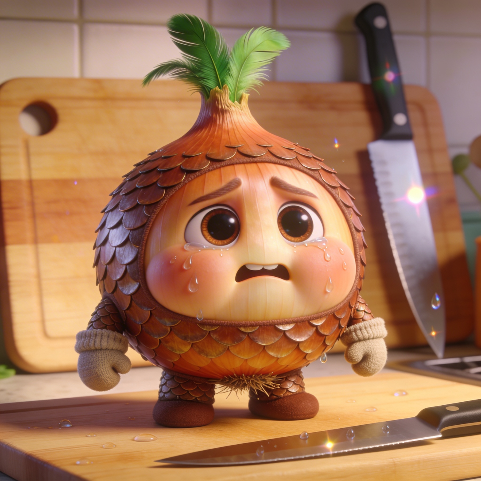 Антропоморфный лук в стиле Pixar, 3D-рендер, высокая детализация, cute и выразительный. Возраст 40 лет, округлое тельце с коричневой шелухой как одеждой, большие грустные глаза с постоянными слезинками, рот в форме плачущей улыбки. Руки-отростки с перчатками. Короткие 'волосы' из зелёных перьев. Пухлый, жалостливый вид. Освещение драматическое, с бликами слёз. Фон - кухонная доска с ножом. Стиль Disney/Pixar, насыщенные цвета, эмоциональные мимики, реалистичные текстуры шелухи.