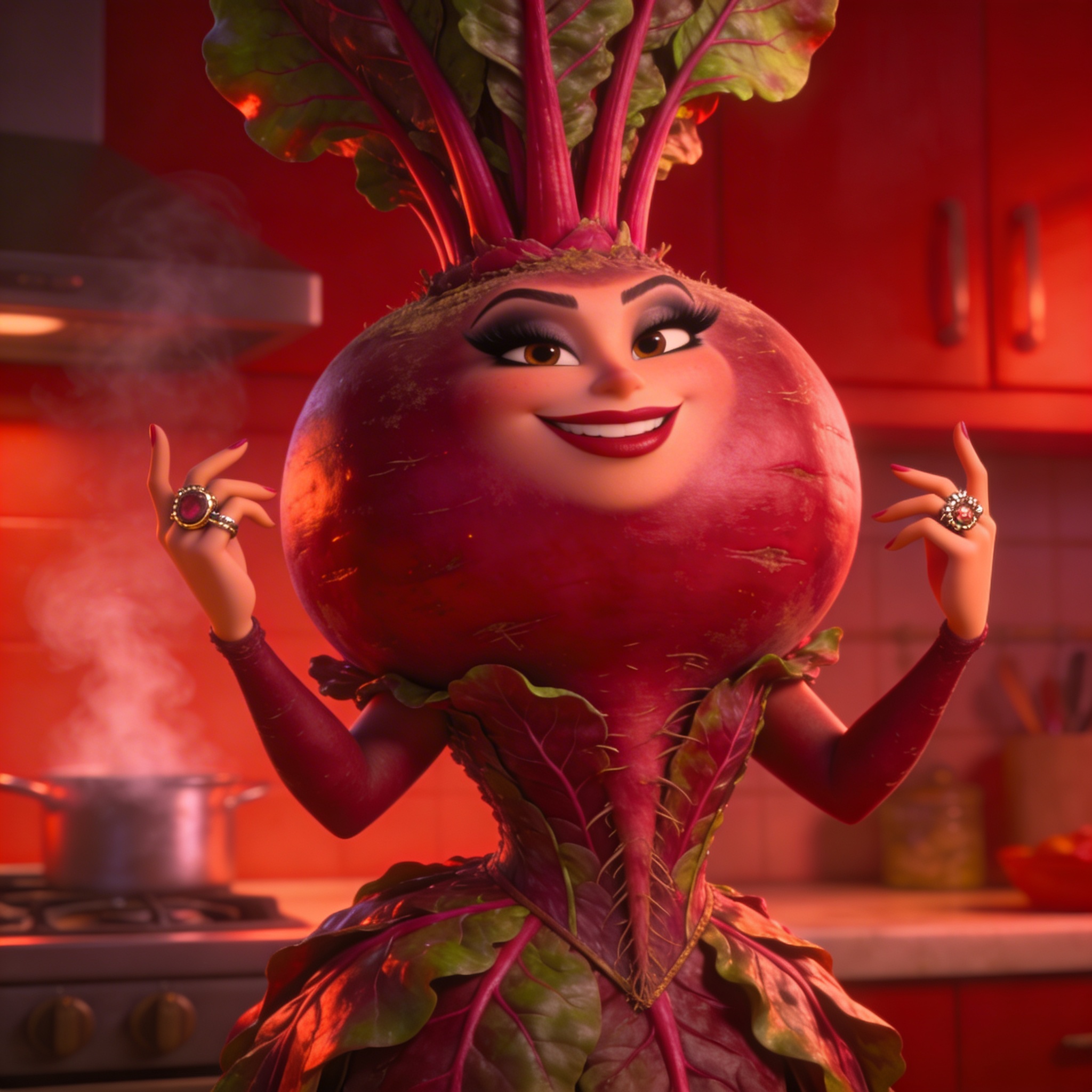 Антропоморфная свёкла в стиле Pixar, 3D-рендер, высокая детализация, соблазнительная и яркая. Возраст 35 лет, пышное бордовое тельце, соблазнительные глаза с smoky макияжем, чувственная улыбка. 'Волосы' из листьев, ручки с кольцами. Одета в элегантное платье из листьев. Драматичный, уверенный вид. Глубокое красное освещение, блики. Фон - кухня с паром. Стиль Disney/Pixar, насыщенные красные тона, детализированная кожура, эмоциональные жесты.