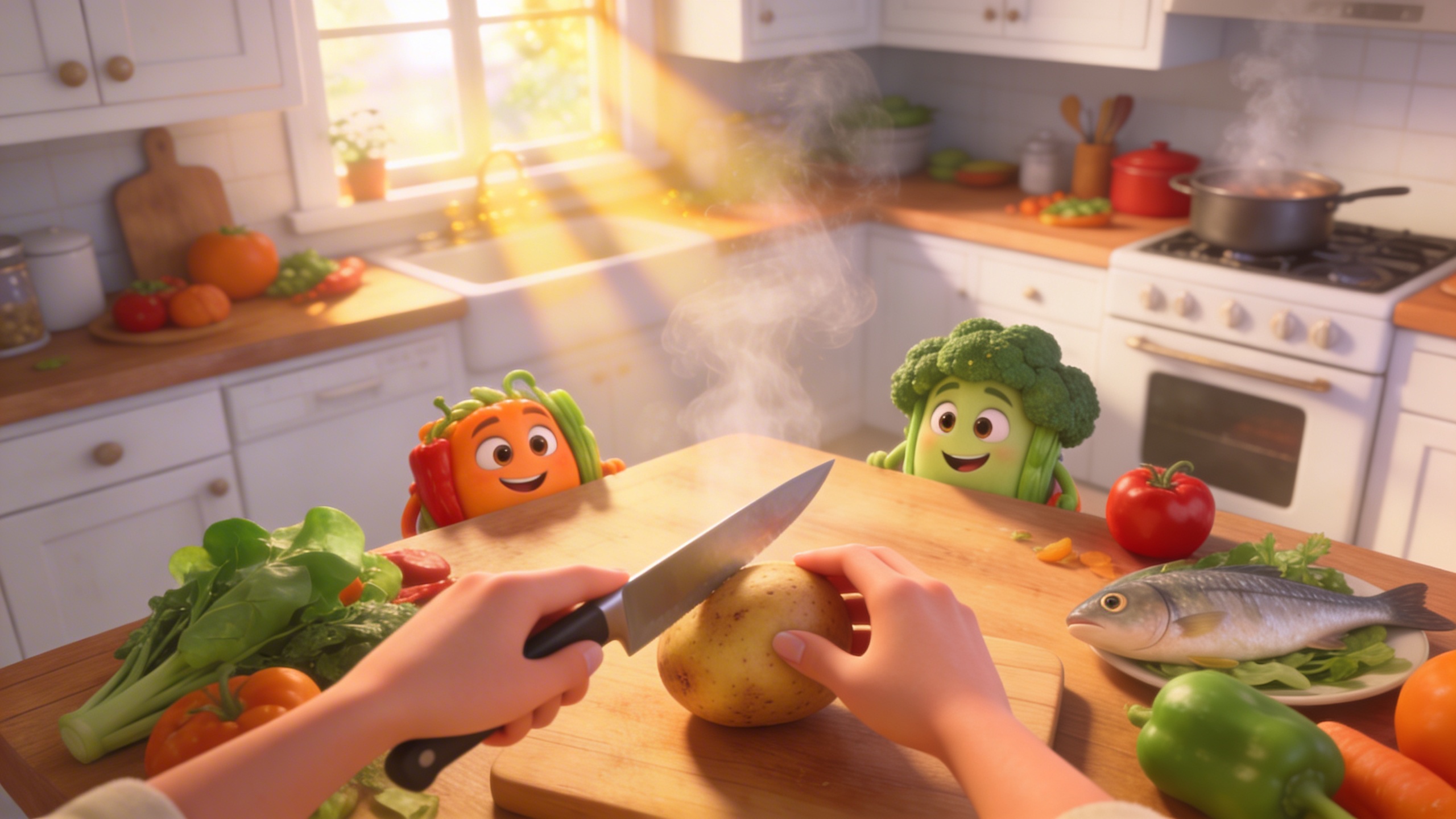 3D Pixar style. Современная кухня с белыми шкафчиками, деревянным столом, усыпанным свежими овощами и рыбой, пар от варки в воздухе. Широкий установочный кадр с лёгким наклоном сверху, фокус на центре стола. Тёплое утреннее освещение из окна, золотистые лучи на поверхностях. Атмосфера весёлая и аппетитная, полная ожидания. Женские элегантные руки в кадре держат нож над картошкой, антропоморфные ингредиенты в Pixar-стиле выглядывают с любопытством, улыбаясь. Палитра ярких натуральных цветов: зелень, оранж, красный, с акцентами белого. 3D-рендер, high detail, cute выражения.