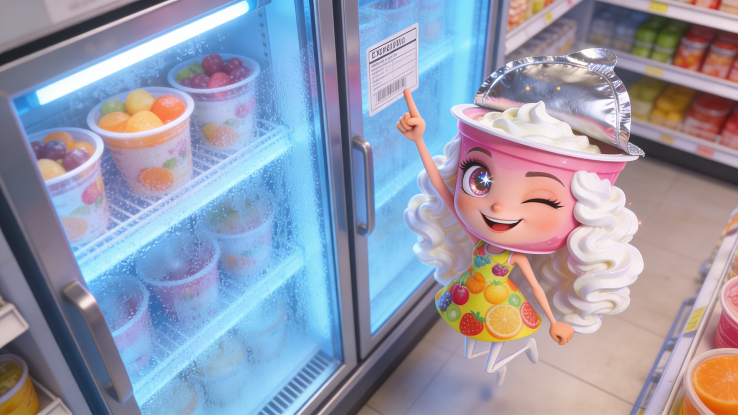 3D Pixar style. Яркий холодильный отдел супермаркета с йогуртами, стеклянные дверцы с инеем, полки с фруктовыми стаканчиками, холодный синий свет от ламп внутри. Wide shot с bird's eye view слегка сверху. Атмосфера свежая и мотивирующая. Йогуртик подпрыгивает, показывает на срок годности большим пальцем вверх, улыбается широко с wink. Цвета яркие розовые, фруктовые оранжевые и белые, high detail Pixar 3D animation, expressive joyful. Character appearance reference (MUST match exactly): - Йогуртик: Антропоморфный йогурт в стиле Pixar, cute 3D render: розовый стаканчик с большими искрящимися глазами, озорная улыбка, длинные завитые волосы из взбитых сливок, стройная фигура 18 лет, тонкие ручки-ножки, фольга-крышка как шляпка, одежда в ярком платьице с фруктовыми принтами, игривый энергичный vibe, яркое дневное освещение с бликами, фон фруктов и ложек, high detail expressive facial expressions, Disney Pixar animation style.