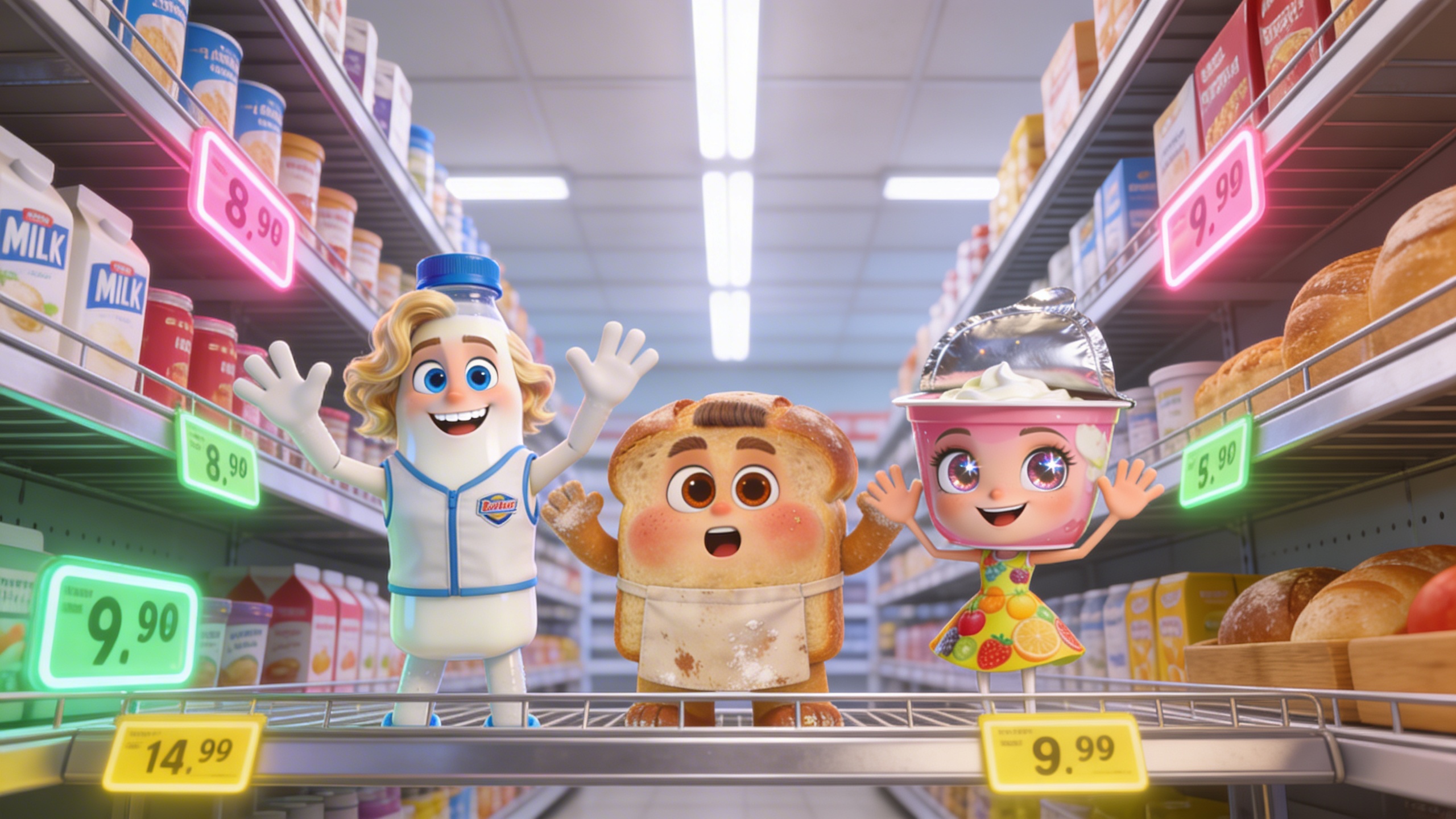 3D Pixar style. Яркий супермаркетный отдел молочки и выпечки с металлическими полками, заставленными рядами упаковок, неоновые ценники мигают, флуоресцентные лампы заливают пространство холодным белым светом с лёгкими тенями. Широкий establishing shot с лёгким наклоном снизу вверх, фокус на центральной полке. Атмосфера весёлая и динамичная, с ощущением ожидания. Молочко, Хлебушек и Йогуртик стоят плечом к плечу, машут руками возбуждённо с широкими улыбками и удивлёнными глазами. Палитра ярких белых, жёлтых и розовых тонов в Pixar 3D-анимационном стиле, high detail, cute. Character appearance reference (MUST match exactly): - Молочко: Антропоморфная бутылка молока в стиле Pixar, милый 3D-рендер с высокодетализированными чертами: большие выразительные голубые глаза, широкая дружелюбная улыбка с белыми зубками, короткие волнистые светлые волосы, стройное тело около 25 лет, руки и ноги из пластика с каплями конденсата для свежести, белая бутылка с синей крышкой, одет в casual жилетку супермаркета с логотипом, энергичный позитивный vibe, мягкое студийное освещение с бликами, фон полки с ярлыками продуктов, cute expressive facial expressions, Disney Pixar high detail render. - Хлебушек: Антропоморфный хлеб в стиле Pixar, 3D high detail: румяная корочка, большие карие глаза с ехидным прищуром, пухлые щёки, короткая стрижка из теста, крепкое коренастое тело 40 лет, руки-ножки с крошками, классическая форма батона, одежда в виде фартука пекаря с мукой, ворчливый скептический vibe, тёплое золотистое освещение печи, фон деревянная доска и мука, expressive face с эмоциями, vibrant Pixar style. - Йогуртик: Антропоморфный йогурт в стиле Pixar, cute 3D render: розовый стаканчик с большими искрящимися глазами, озорная улыбка, длинные завитые волосы из взбитых сливок, стройная фигура 18 лет, тонкие ручки-ножки, фольга-крышка как шляпка, одежда в ярком платьице с фруктовыми принтами, игривый энергичный vibe, яркое дневное освещение с бликами, фон фруктов и ложек, high detail expressive facial expressions, Disney Pixar animation style.