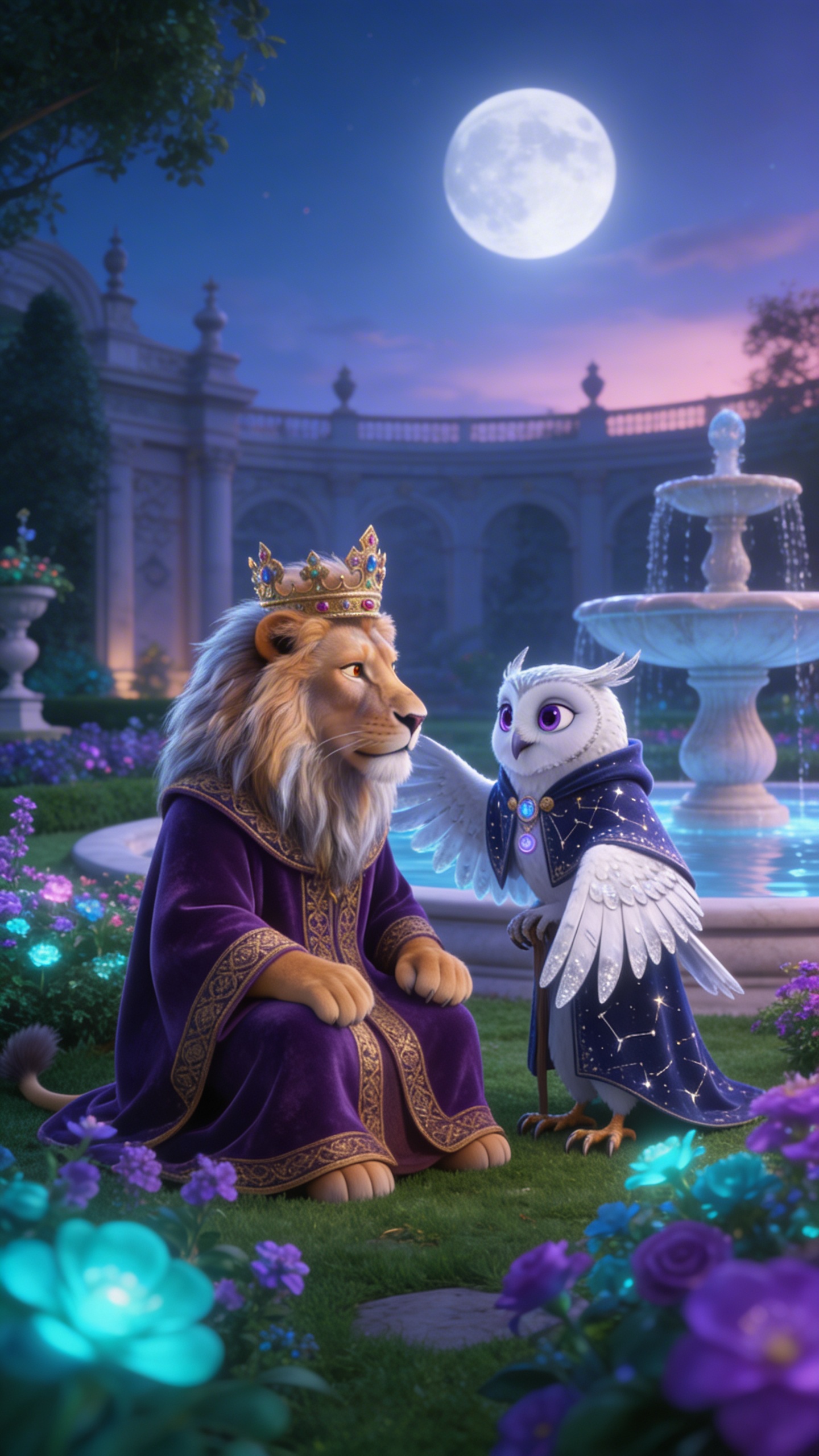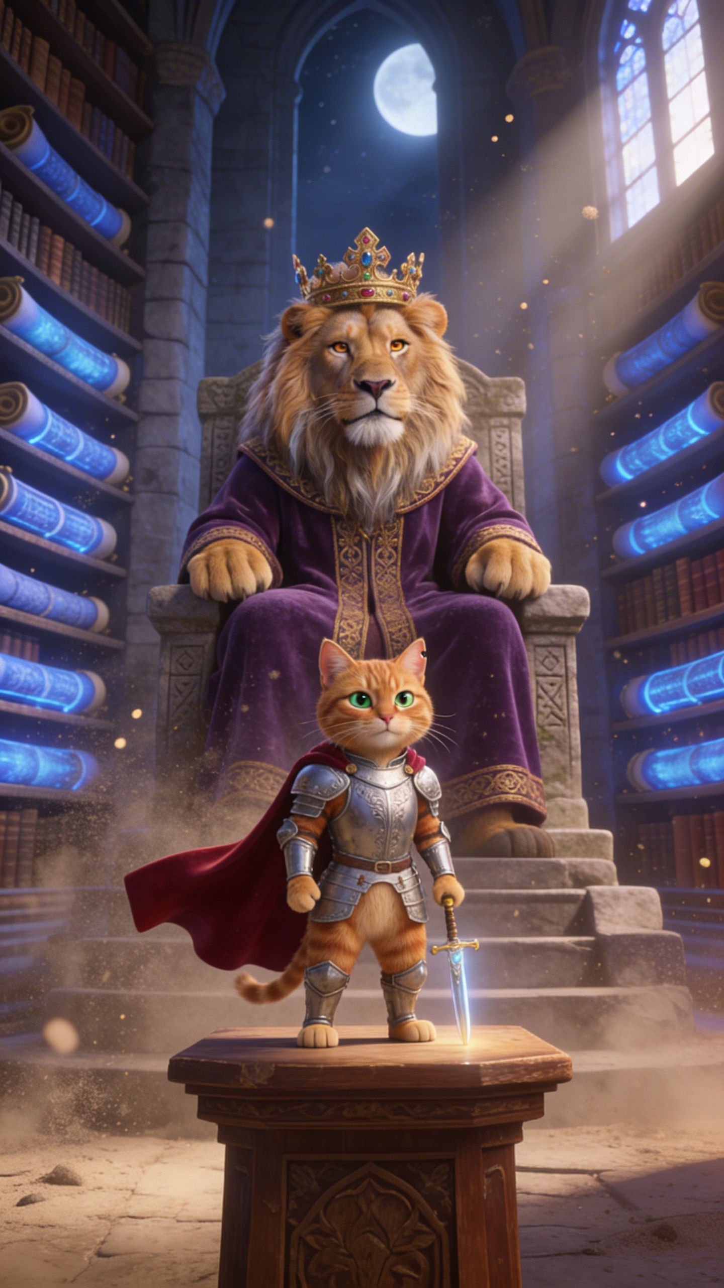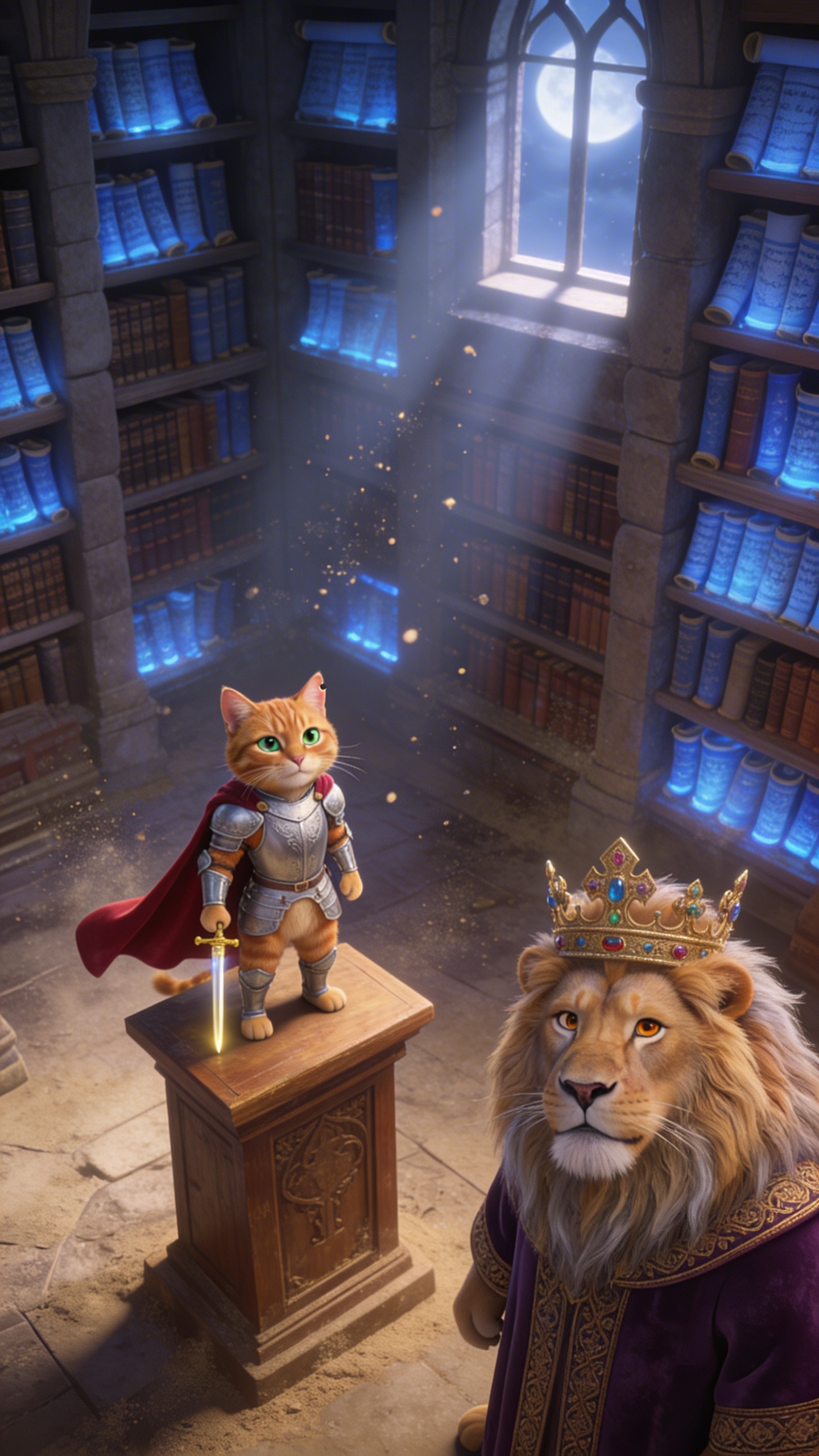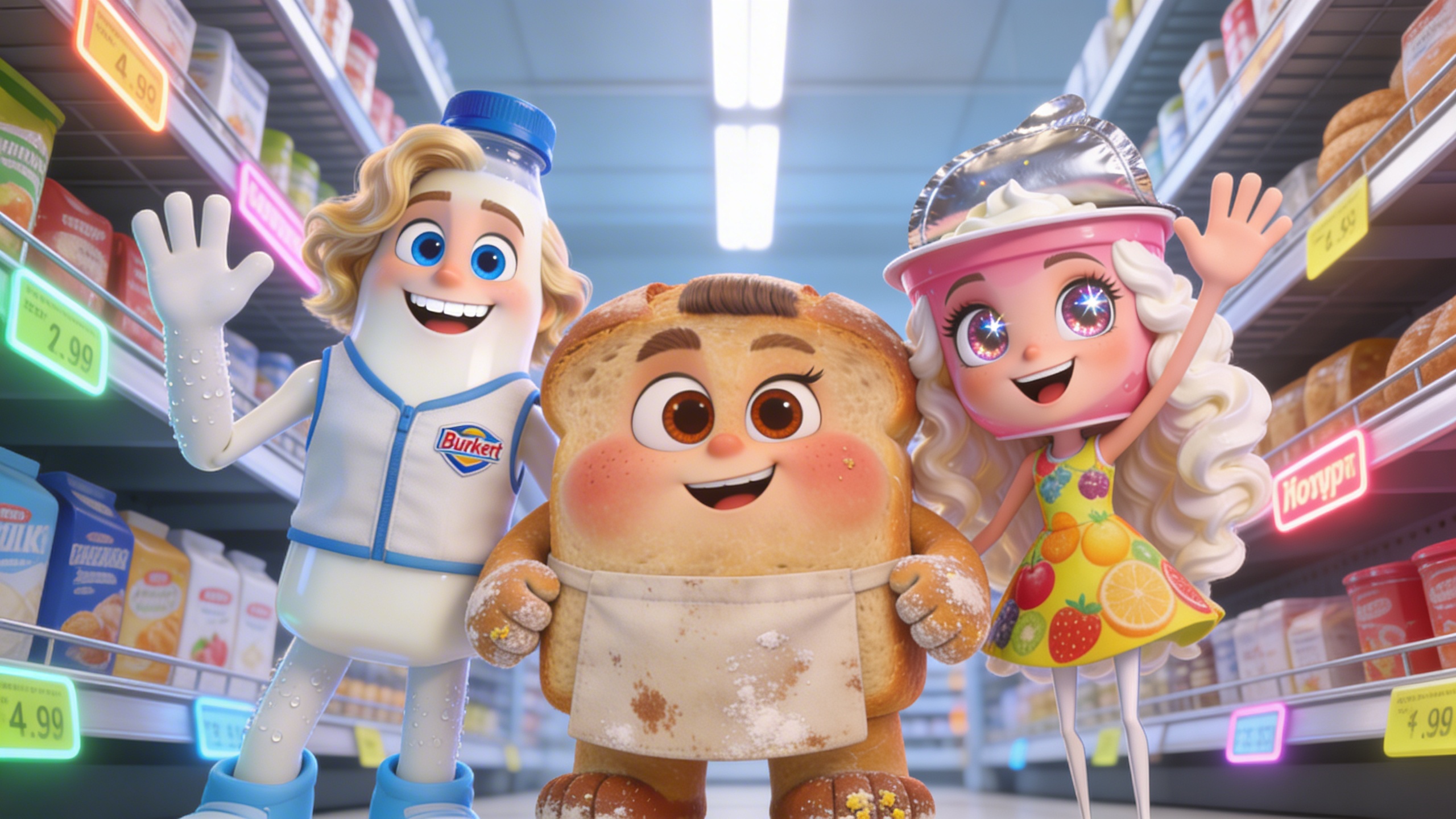 3D Pixar style. Яркий супермаркетный отдел молочки и выпечки с металлическими полками, заставленными рядами упаковок, неоновые ценники мигают, флуоресцентные лампы заливают пространство холодным белым светом с лёгкими тенями. Широкий establishing shot с лёгким наклоном снизу вверх, фокус на центральной полке. Атмосфера весёлая и динамичная, с ощущением ожидания. Молочко, Хлебушек и Йогуртик стоят плечом к плечу, машут руками возбуждённо с широкими улыбками и удивлёнными глазами. Палитра ярких белых, жёлтых и розовых тонов в Pixar 3D-анимационном стиле, high detail, cute. Character appearance reference (MUST match exactly): - Молочко: Антропоморфная бутылка молока в стиле Pixar, милый 3D-рендер с высокодетализированными чертами: большие выразительные голубые глаза, широкая дружелюбная улыбка с белыми зубками, короткие волнистые светлые волосы, стройное тело около 25 лет, руки и ноги из пластика с каплями конденсата для свежести, белая бутылка с синей крышкой, одет в casual жилетку супермаркета с логотипом, энергичный позитивный vibe, мягкое студийное освещение с бликами, фон полки с ярлыками продуктов, cute expressive facial expressions, Disney Pixar high detail render. - Хлебушек: Антропоморфный хлеб в стиле Pixar, 3D high detail: румяная корочка, большие карие глаза с ехидным прищуром, пухлые щёки, короткая стрижка из теста, крепкое коренастое тело 40 лет, руки-ножки с крошками, классическая форма батона, одежда в виде фартука пекаря с мукой, ворчливый скептический vibe, тёплое золотистое освещение печи, фон деревянная доска и мука, expressive face с эмоциями, vibrant Pixar style. - Йогуртик: Антропоморфный йогурт в стиле Pixar, cute 3D render: розовый стаканчик с большими искрящимися глазами, озорная улыбка, длинные завитые волосы из взбитых сливок, стройная фигура 18 лет, тонкие ручки-ножки, фольга-крышка как шляпка, одежда в ярком платьице с фруктовыми принтами, игривый энергичный vibe, яркое дневное освещение с бликами, фон фруктов и ложек, high detail expressive facial expressions, Disney Pixar animation style.