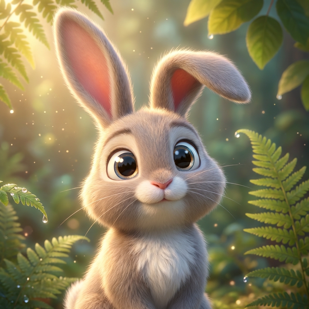 Strong rule: style --- 3D Pixar ---. Вертикальный портрет 9:16. Очаровательный, невероятно пушистый маленький лесной зайчик с большими выразительными, влажно блестящими глазами и длинными мягкими ушками, одно из которых забавно загнуто вниз. Шерстка теплого светло-серого оттенка с пушистой белоснежной грудкой и крошечным розовым носиком. Зайчик выглядит милым, невинным, полным энергии и очень любопытным. Освещение мягкое, сказочное, золотистый утренний свет пробивается сквозь листву, создавая красивые теплые блики на текстуре шерстки. Фон — мягко размытый волшебный лес с гигантскими папоротниками, светящимися пылинками и каплями росы. Стиль: высококачественная 3D-анимация, уровень Pixar или Disney, невероятная детализация меха, яркие насыщенные цвета.