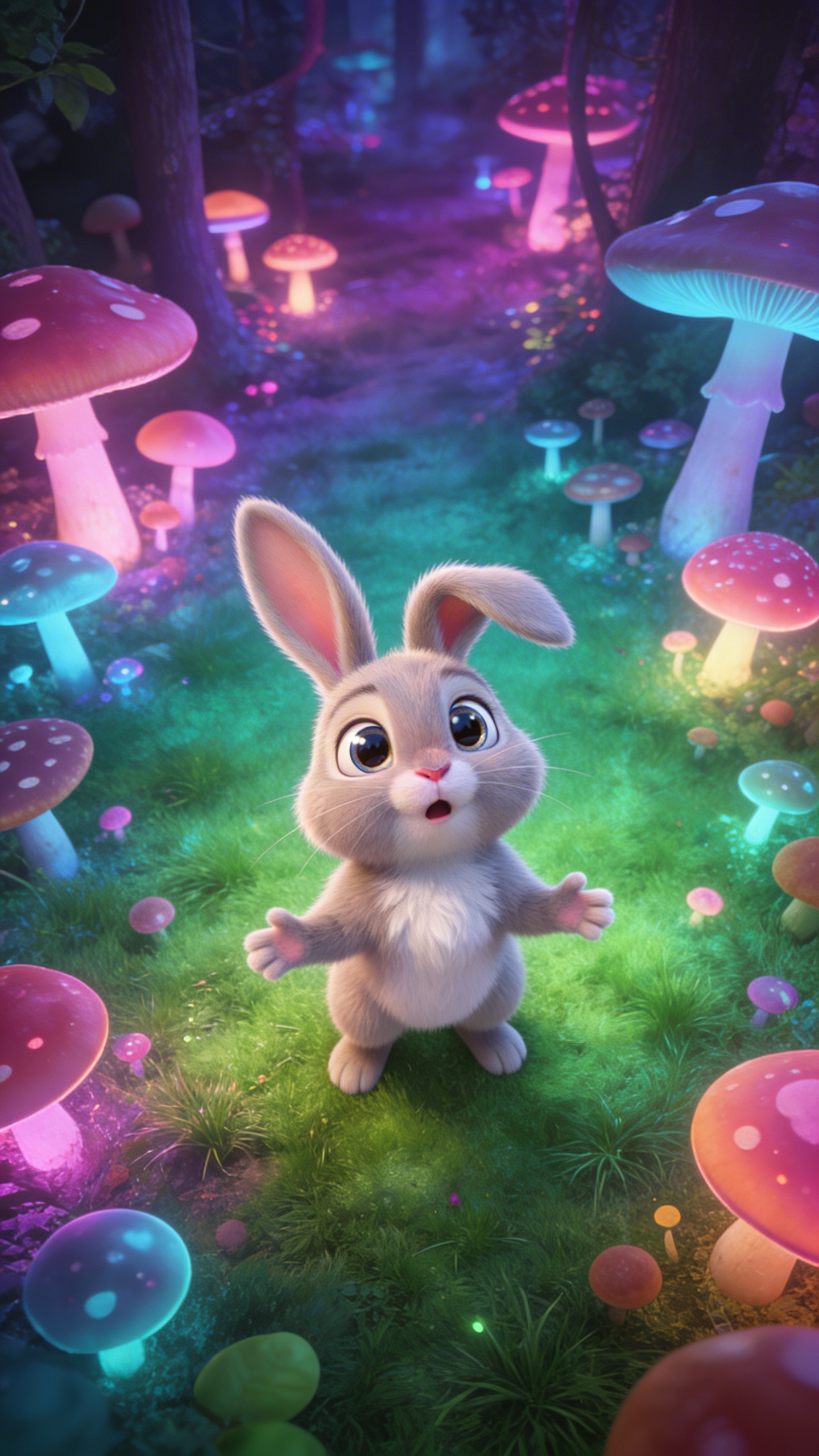 Strong rule: style --- 3D Pixar ---. Вертикальный кадр 9:16. Обширная скрытая лесная поляна, заполненная гигантскими, размером с деревья, грибами, которые излучают мягкий неоновый свет. Панорамный общий план с высоты птичьего полета, медленно опускающийся к земле. Освещение исходит от самих грибов — мягкое, рассеянное, многоцветное свечение, создающее волшебные градиенты на траве. Атмосфера абсолютного чуда, сказочной эйфории и безмятежности. Персонаж стоит неподвижно в самом центре поляны, запрокинув голову высоко вверх, его лапки удивленно разведены в стороны. Цветовая палитра: яркие, насыщенные сказочные цвета, доминирование мадженты, циана и неоново-зеленого. Character appearance reference (MUST match exactly): - Пушок: Вертикальный портрет 9:16. Очаровательный, невероятно пушистый маленький лесной зайчик с большими выразительными, влажно блестящими глазами и длинными мягкими ушками, одно из которых забавно загнуто вниз. Шерстка теплого светло-серого оттенка с пушистой белоснежной грудкой и крошечным розовым носиком. Зайчик выглядит милым, невинным, полным энергии и очень любопытным. Освещение мягкое, сказочное, золотистый утренний свет пробивается сквозь листву, создавая красивые теплые блики на текстуре шерстки. Фон — мягко размытый волшебный лес с гигантскими папоротниками, светящимися пылинками и каплями росы. Стиль: высококачественная 3D-анимация, уровень Pixar или Disney, невероятная детализация меха, яркие насыщенные цвета.