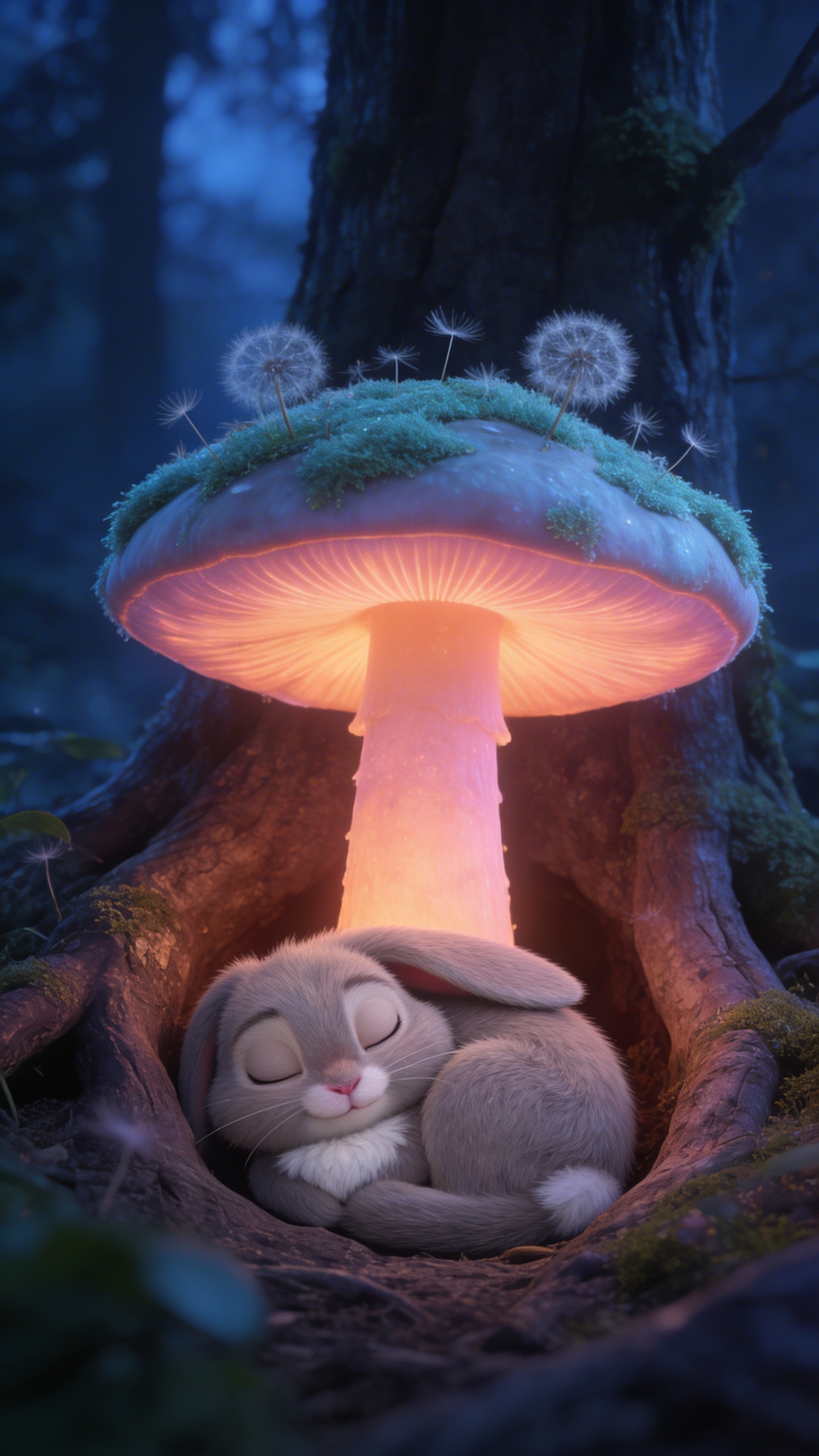Strong rule: style --- 3D Pixar ---. Вертикальный кадр 9:16. Уютное углубление у корней гигантского светящегося гриба, устланное мягким изумрудным мхом и пухом одуванчиков. Крупный план, снятый сверху под небольшим углом. Освещение очень мягкое, интимное, теплое розовато-оранжевое свечение от ножки гриба служит уютным ночником в сгущающихся сумерках леса. Атмосфера полного спокойствия, безопасности, уюта и сладкой дремоты. Персонаж свернулся плотным клубком, закрыв глаза и безмятежно улыбаясь во сне, его поза выражает абсолютное расслабление. Цветовая палитра: глубокие синие тона ночного леса контрастируют с теплыми персиковыми и розовыми оттенками в центре кадра. Character appearance reference (MUST match exactly): - Пушок: Вертикальный портрет 9:16. Очаровательный, невероятно пушистый маленький лесной зайчик с большими выразительными, влажно блестящими глазами и длинными мягкими ушками, одно из которых забавно загнуто вниз. Шерстка теплого светло-серого оттенка с пушистой белоснежной грудкой и крошечным розовым носиком. Зайчик выглядит милым, невинным, полным энергии и очень любопытным. Освещение мягкое, сказочное, золотистый утренний свет пробивается сквозь листву, создавая красивые теплые блики на текстуре шерстки. Фон — мягко размытый волшебный лес с гигантскими папоротниками, светящимися пылинками и каплями росы. Стиль: высококачественная 3D-анимация, уровень Pixar или Disney, невероятная детализация меха, яркие насыщенные цвета.