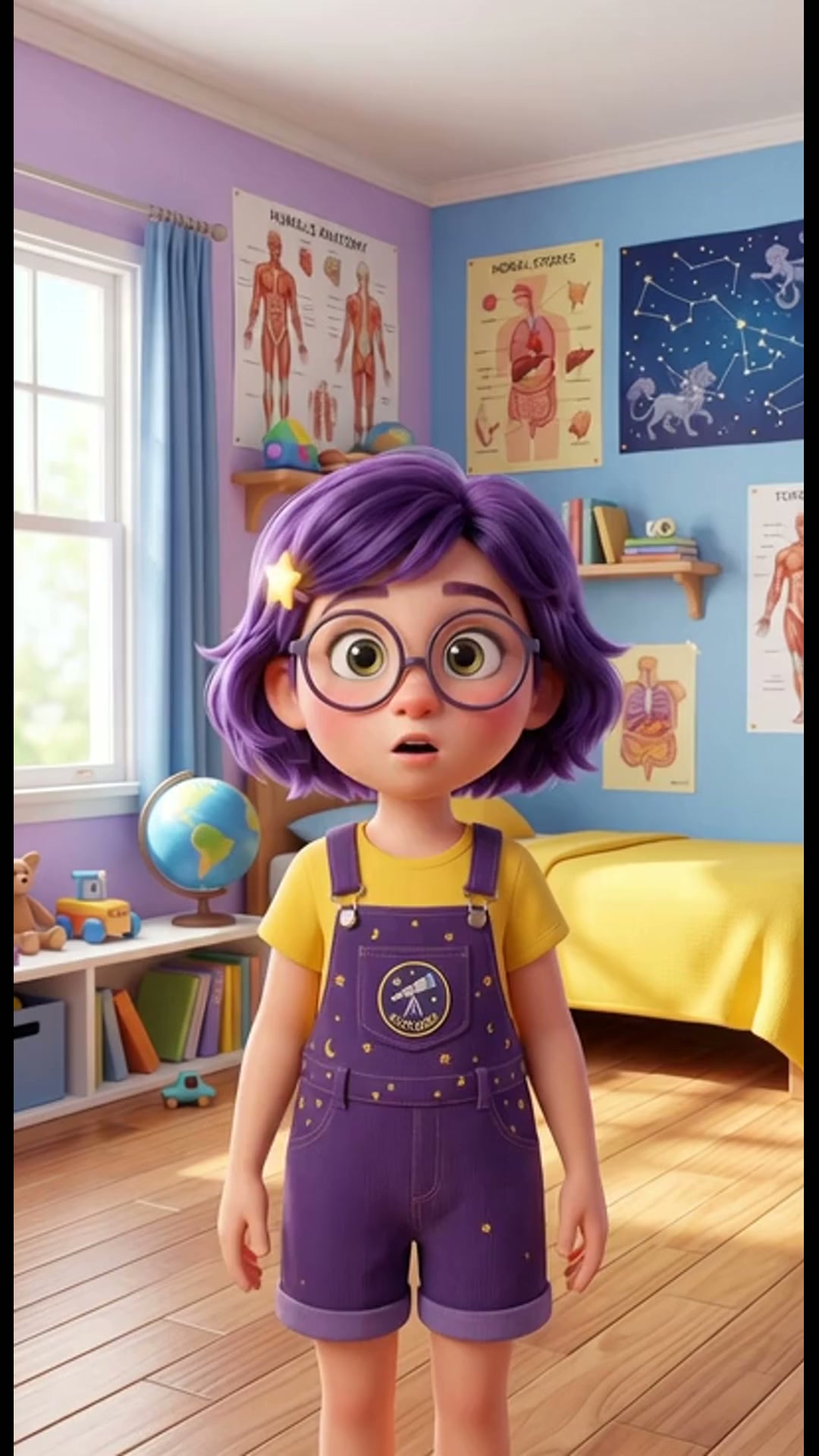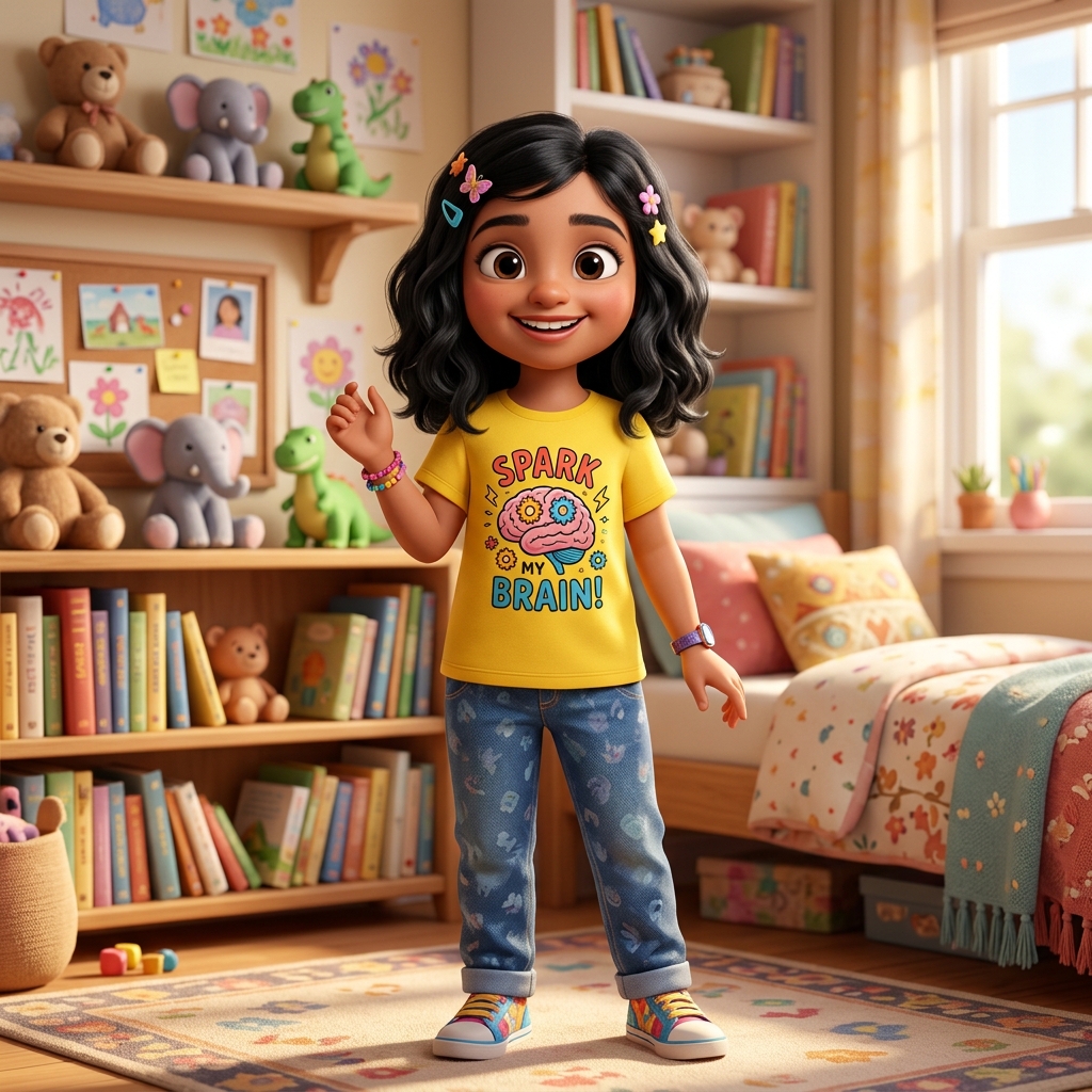 3D animated style inspired by Pixar movies with vibrant colors, smooth textures, and expressive characters. Full body character portrait of girl astronaut. A bright, cheerful 3D animated scene inside a colorful cartoon-style spaceship classroom. Veda, the main mascot — a confident and cheerful 8-year-old girl with big expressive eyes and a bright smile. She wears signature purple-and-yellow space overalls with tiny star patterns, a glowing golden star hair clip, round smart-looking glasses, and a small rocket-shaped backpack. Veda is slightly brighter and softly glowing compared to the other children, with a subtle warm light highlight around her so she naturally stands out as the leader.. STRICT REQUIREMENTS: Full body shot from head to feet, standing pose, facing camera, plain white or light gray background ONLY, ABSOLUTELY NO text, NO letters, NO words, NO watermarks, NO signatures anywhere in image. High quality, detailed, consistent lighting, professional character design, single character only.