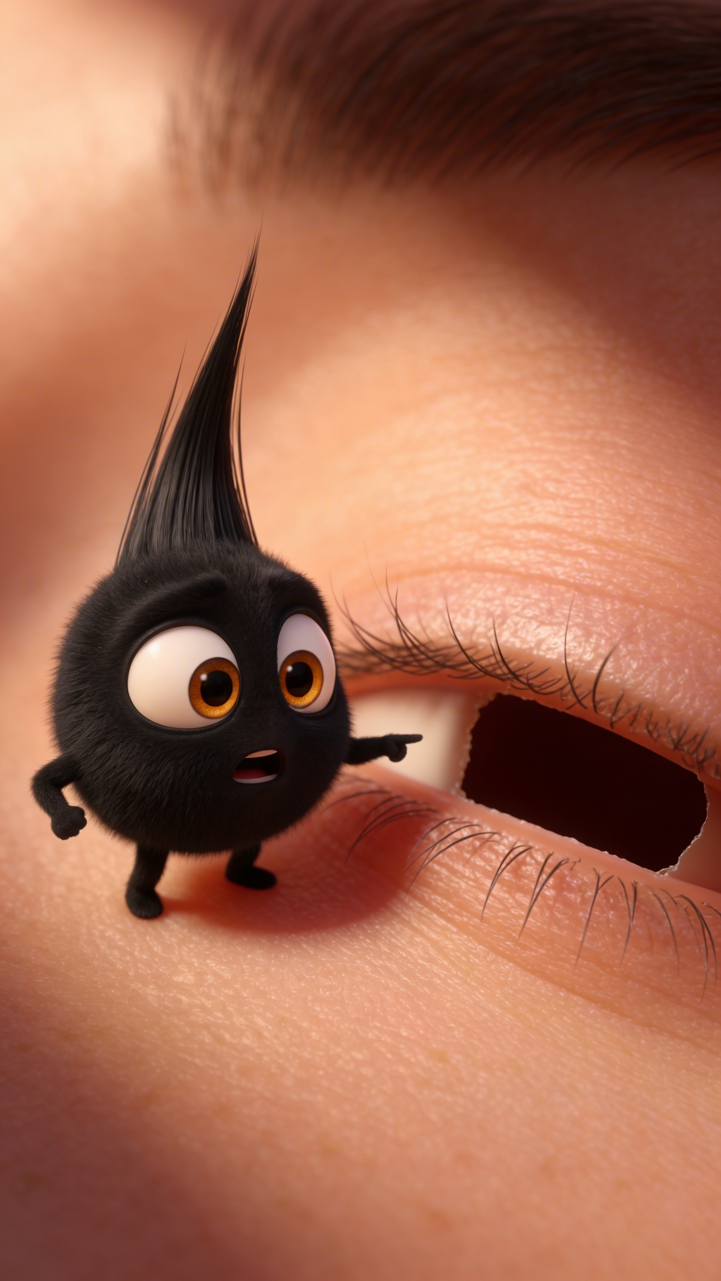 Strong rule: style --- Animación 3D estilo Pixar ---. Pestañita señala con preocupación un hueco vacío en la línea de las pestañas donde falta una extensión. Tiene una expresión de alarma y urgencia. El fondo muestra las pestañas restantes, algunas de ellas un poco desordenadas. La iluminación es dramática, enfocando el espacio vacío. Character appearance reference (MUST match exactly): - Pestañita: Un personaje de animación 3D pequeño y adorable que representa una extensión de pestañas. Tiene un cuerpo negro redondeado, brazos y piernas diminutos, y un mechón de pelo negro largo y puntiagudo que sale de su cabeza como una pestaña. Sus ojos son grandes, de color ámbar, muy expresivos. El estilo es de película de animación moderna, con texturas suaves, iluminación cálida y un fondo desenfocado que sugiere la piel humana y las pestañas naturales. El personaje tiene una personalidad vibrante y gestos exagerados.