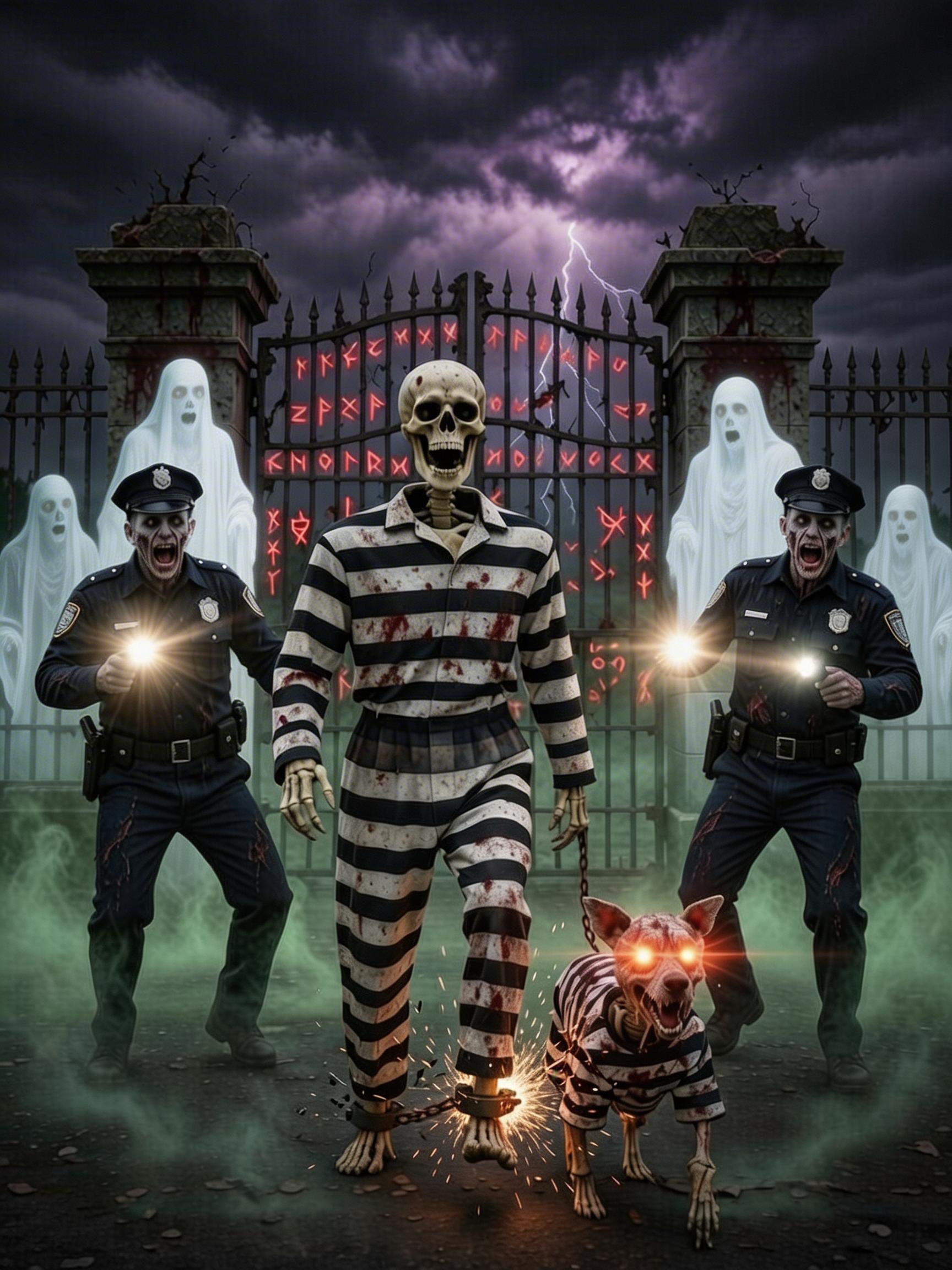 Скелет в полосатой тюремной робе, которого сопровождают два зомби-полицейских с фонариками. Они ведут на поводке зомби-собаку. Действие происходит у ворот тюрьмы с привидениями во время грозы. Атмосфера мрачная, жуткая и наполненная ужасом.
