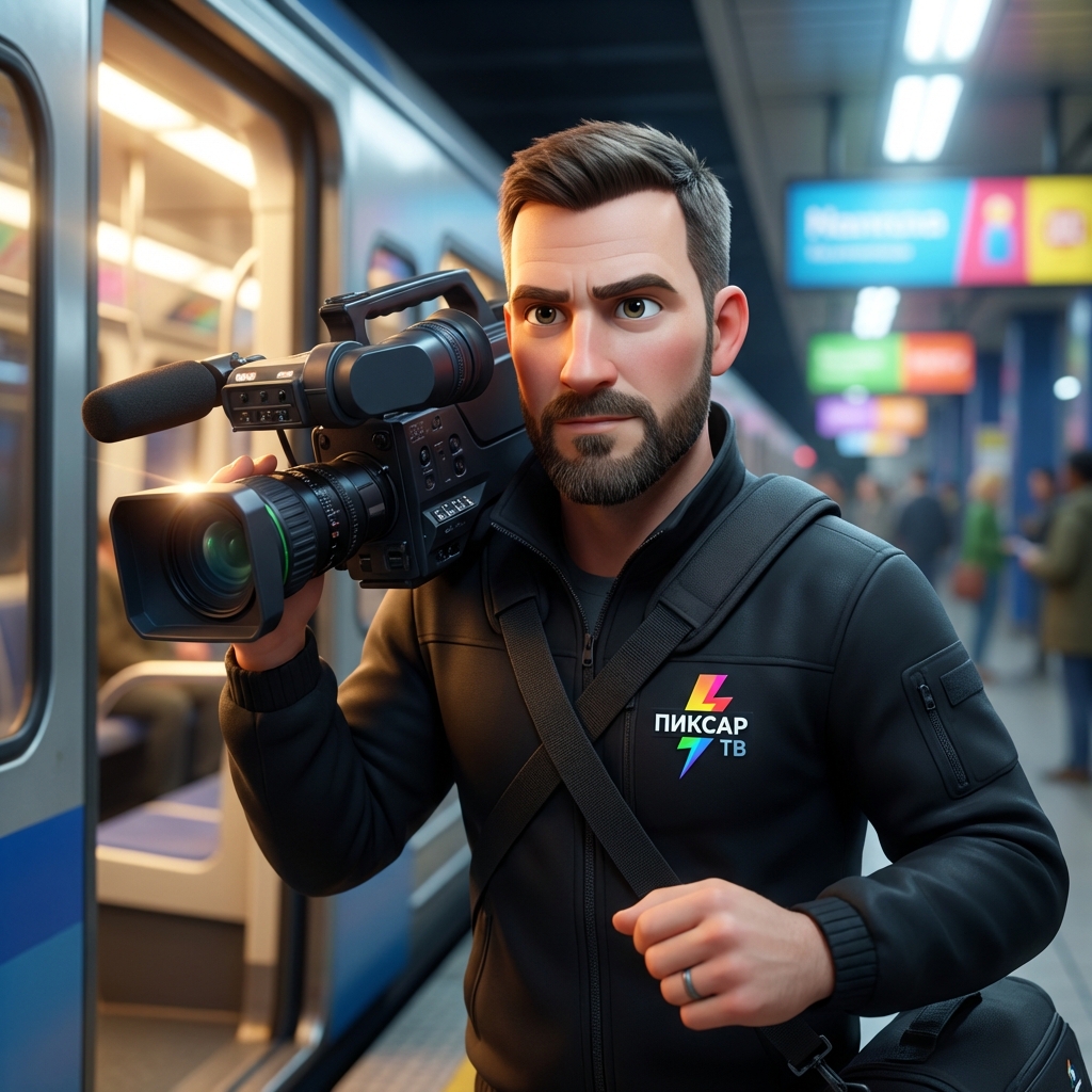 Strong rule: style --- 3D Pixar ---. Мужчина 35-40 лет, уверенный и цепкий взгляд, аккуратная короткая борода. Одет в удобную чёрную куртку с небольшим ярким логотипом телеканала на груди, на плече висит широкий ремень от массивной профессиональной видеокамеры. Энергетика очень деловая, быстрая, профессиональная. Реалистичный 3D-стиль Pixar, высокая детализация оборудования. Освещение контрастное и динамичное, холодный люминесцентный свет из открытых дверей станции метро смешивается с тёплым светом внутри вагона, создавая блики на объективе камеры. Фон — платформа станции метро в расфокусе с яркими рекламными щитами.