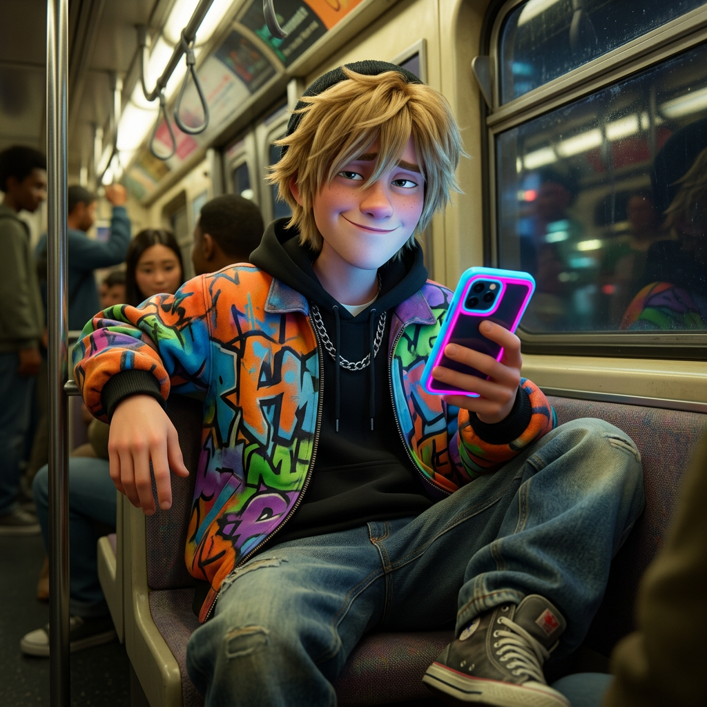 Strong rule: style --- 3D Pixar ---. Подросток 16-18 лет, взлохмаченные светлые волосы, падающие на лоб, дерзкая и самоуверенная ухмылка. Одет в яркую оверсайз-куртку с пестрым граффити-принтом, массивную цепь на шее и широкие джинсы. Держит в руках современный смартфон в ярком неоновом чехле. Энергетика абсолютно беззаботная, шумная и слегка циничная. Реалистичный 3D-стиль Pixar, высочайшая детализация текстур ткани и пластика. Освещение смешанное — тёплый свет вагона сверху и холодный синеватый свет от экрана смартфона, ярко падающий на лицо снизу. Фон — вечернее метро с размытыми фигурами других пассажиров.