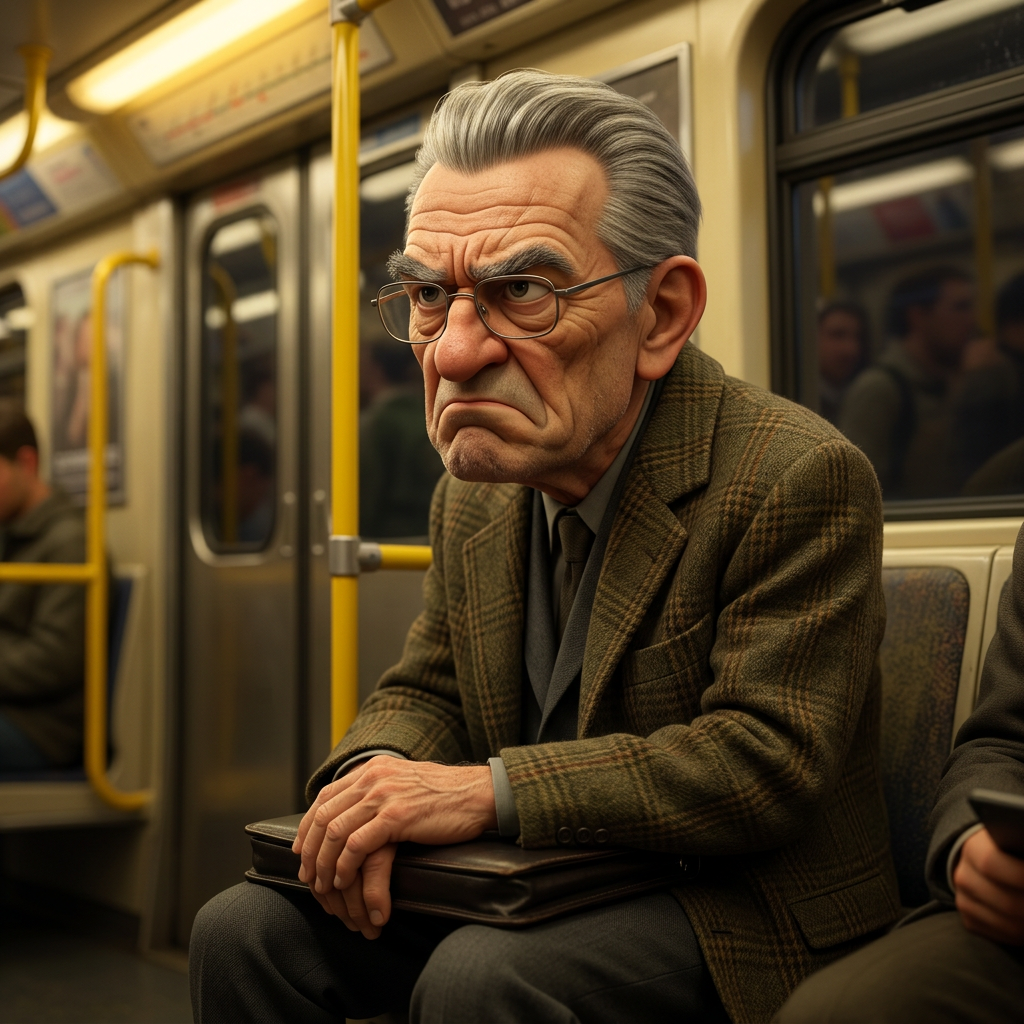 Strong rule: style --- 3D Pixar ---. Пожилой мужчина около 60 лет, седые волосы, зачесанные назад, густые нахмуренные брови, суровое и недовольное выражение лица. Одет в классический серый костюм, поверх которого надет тёплый твидовый пиджак в клетку, на носу очки в тонкой металлической оправе. Выглядит очень консервативным, строгим и уставшим от современного городского шума. Реалистичный 3D-стиль Pixar, сильный акцент на глубоких морщинах и текстуре стареющей кожи. Тёплый верхний свет вагона метро, жестко подчёркивающий строгие черты лица. Фон — металлические двери и желтые поручни вагона в сильном расфокусе.