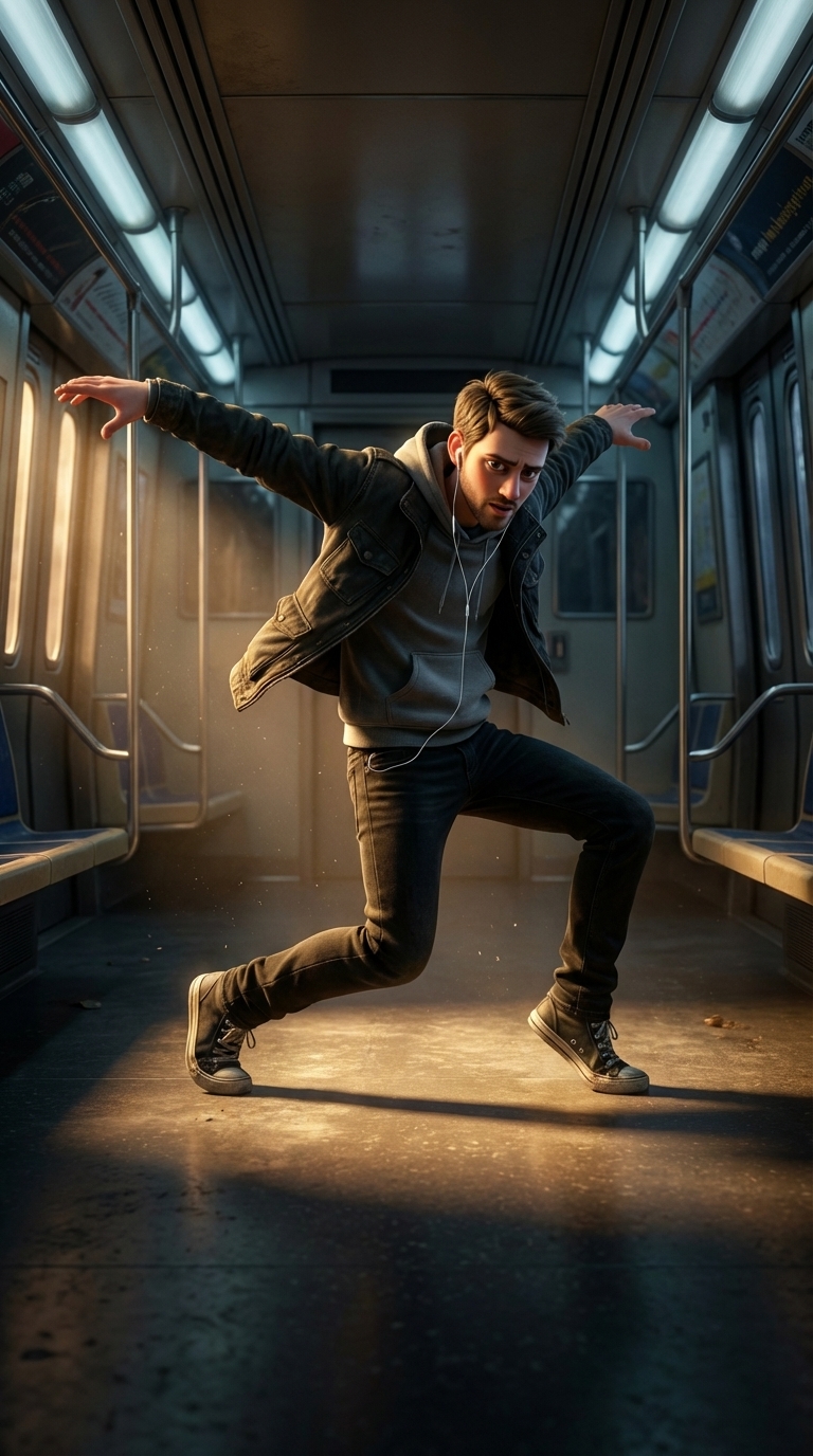 Strong rule: style --- 3D Pixar ---. Просторная площадка возле дверей вагона метро, освобождённая от людей. Общий план с небольшого отдаления, показывающий героя в полный рост. Тёплый направленный свет выделяет центр сцены, оставляя края кадра в полумраке. Атмосфера резкого пробуждения, бунта и неожиданной энергии. Герой делает резкий танцевальный выпад, его руки широко раскинуты, тело изогнуто в невероятно динамичной позе уличного танца. Цветовая гамма контрастная, с яркими пятнами света на сером фоне, кинематографичный 3D-стиль. Character appearance reference (MUST match exactly): - Артём: Strong rule: style --- 3D Pixar ---. Молодой парень 23-25 лет, славянские черты лица, короткие тёмно-русые волосы, лёгкая небритость, уставшие, но очень выразительные карие глаза. Худощавое, но спортивное телосложение танцора. Одет в старую тёмную куртку, потертый серый худи, чёрные джинсы и старые кроссовки, в ушах белые проводные наушники. Энергетика уличного танцора, смешанная с глубокой грустью, отчаянием и невероятной внутренней силой. Реалистичный 3D-стиль анимации в духе Pixar, но с более серьёзным, драматичным и взрослым тоном. Мягкое студийное освещение, подчёркивающее фактуру ткани худи и уставшие черты лица, фон — красиво размытый интерьер вагона метро с тёплым желтоватым светом и бликами.
