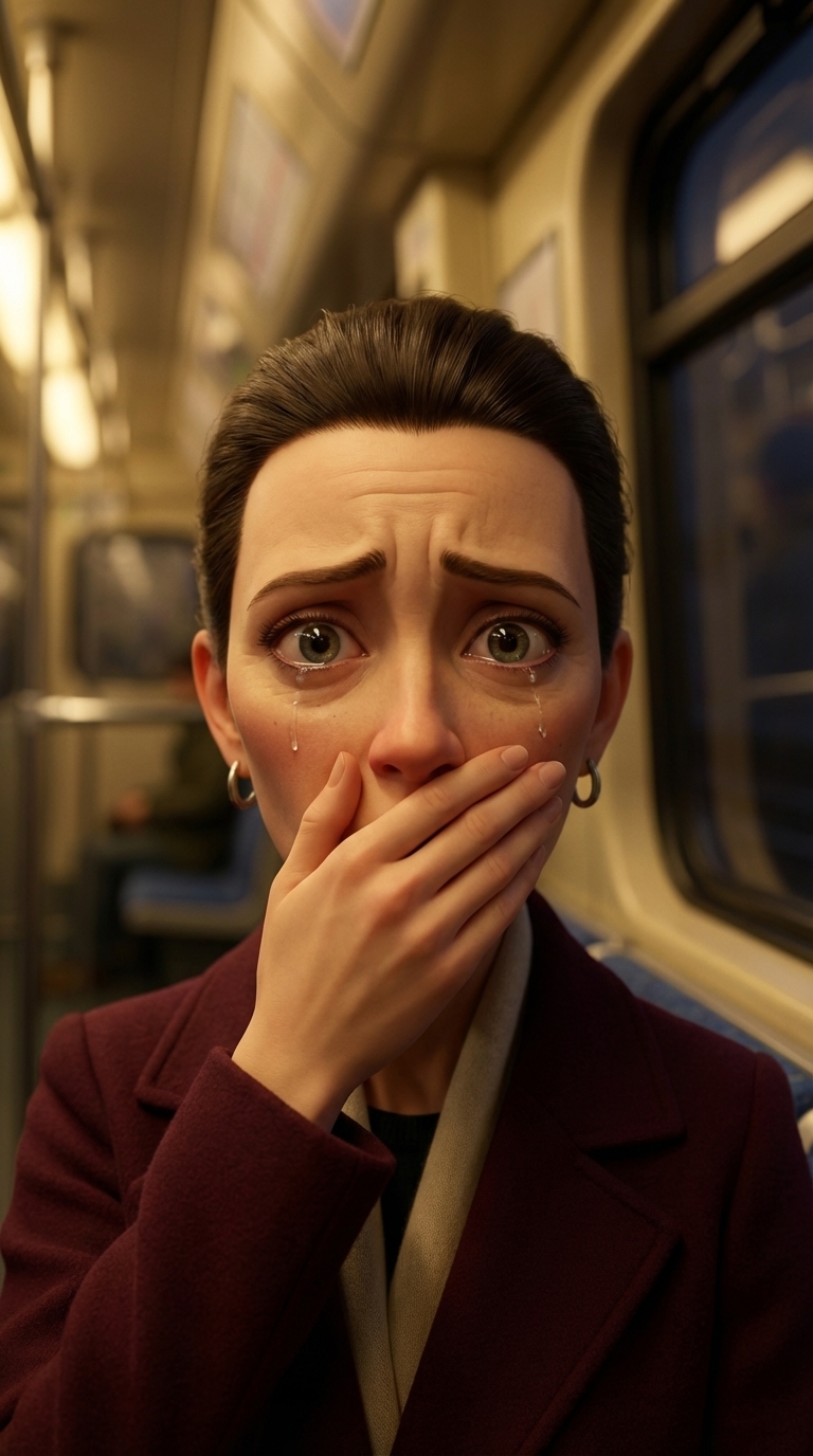 Strong rule: style --- 3D Pixar ---. Сиденья вагона метро на фоне окна. Крупный план лица пассажирки. Тёплый, но тусклый свет вагона мягко ложится на лицо. Атмосфера глубокого раскаяния, шока и разбитого высокомерия. Женщина в ужасе прикрывает рот рукой, её глаза широко раскрыты и блестят от подступающих слёз, прежнее выражение презрения полностью исчезло с лица. Приглушённые тона, кинематографичный 3D-стиль с сильным акцентом на влажные глаза. Character appearance reference (MUST match exactly): - Женщина: Strong rule: style --- 3D Pixar ---. Женщина средних лет, около 40, строгое и ухоженное лицо, собранные в тугой пучок тёмные волосы, тонкие губы. Одета в элегантное, но повседневное осеннее пальто глубокого бордового цвета и светлый кашемировый шарф. Внешность отражает типичную городскую усталость, легкое высокомерие и раздражительность. Реалистичный 3D-стиль Pixar, очень выразительная и подвижная мимика. Освещение тёплое, желтоватое, падающее сверху под углом, создающее контрастные, немного резкие тени на лице, подчеркивающие возраст. Фон — размытые сиденья вагона метро и поручни, приглушённые городские тона, создающие атмосферу вечерней поездки.