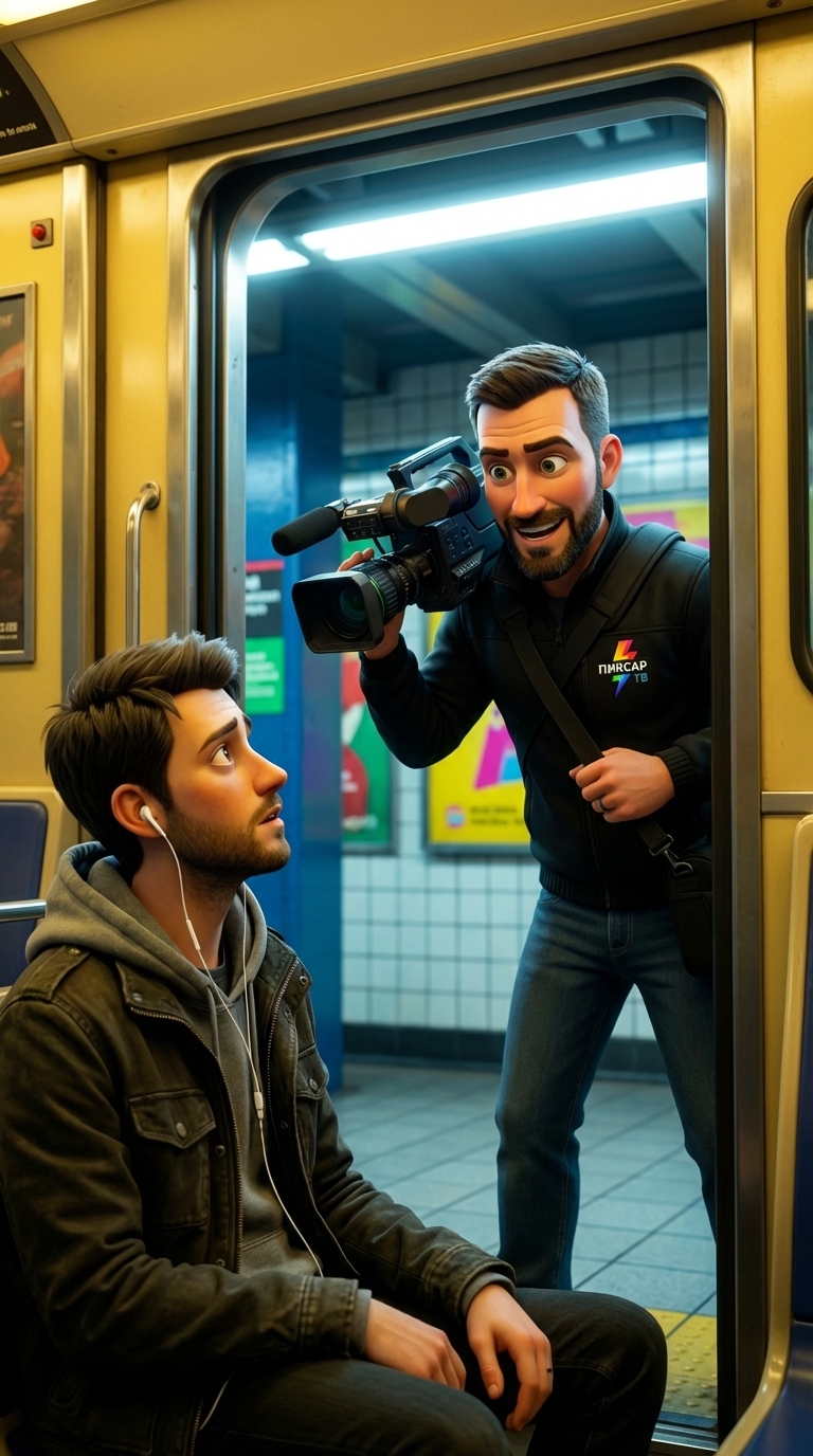 Strong rule: style --- 3D Pixar ---. Открытые двери вагона метро на ярко освещенной ночной станции. Средний план с уровня груди, обрамленный дверным проемом. Яркий, холодный люминесцентный свет платформы резко контрастирует с тёплым желтым светом внутри вагона. Атмосфера неожиданного поворота, интриги и внезапной надежды. Мужчина с большой профессиональной камерой стоит в дверях, пристально глядя на героя, его поза выражает крайнюю заинтересованность и радость узнавания. Яркие, насыщенные цвета станции, кинематографичный 3D-стиль. Character appearance reference (MUST match exactly): - Артём: Strong rule: style --- 3D Pixar ---. Молодой парень 23-25 лет, славянские черты лица, короткие тёмно-русые волосы, лёгкая небритость, уставшие, но очень выразительные карие глаза. Худощавое, но спортивное телосложение танцора. Одет в старую тёмную куртку, потертый серый худи, чёрные джинсы и старые кроссовки, в ушах белые проводные наушники. Энергетика уличного танцора, смешанная с глубокой грустью, отчаянием и невероятной внутренней силой. Реалистичный 3D-стиль анимации в духе Pixar, но с более серьёзным, драматичным и взрослым тоном. Мягкое студийное освещение, подчёркивающее фактуру ткани худи и уставшие черты лица, фон — красиво размытый интерьер вагона метро с тёплым желтоватым светом и бликами. - Телевизионщик: Strong rule: style --- 3D Pixar ---. Мужчина 35-40 лет, уверенный и цепкий взгляд, аккуратная короткая борода. Одет в удобную чёрную куртку с небольшим ярким логотипом телеканала на груди, на плече висит широкий ремень от массивной профессиональной видеокамеры. Энергетика очень деловая, быстрая, профессиональная. Реалистичный 3D-стиль Pixar, высокая детализация оборудования. Освещение контрастное и динамичное, холодный люминесцентный свет из открытых дверей станции метро смешивается с тёплым светом внутри вагона, создавая блики на объективе камеры. Фон — платформа станции метро в расфокусе с яркими рекламными щитами.