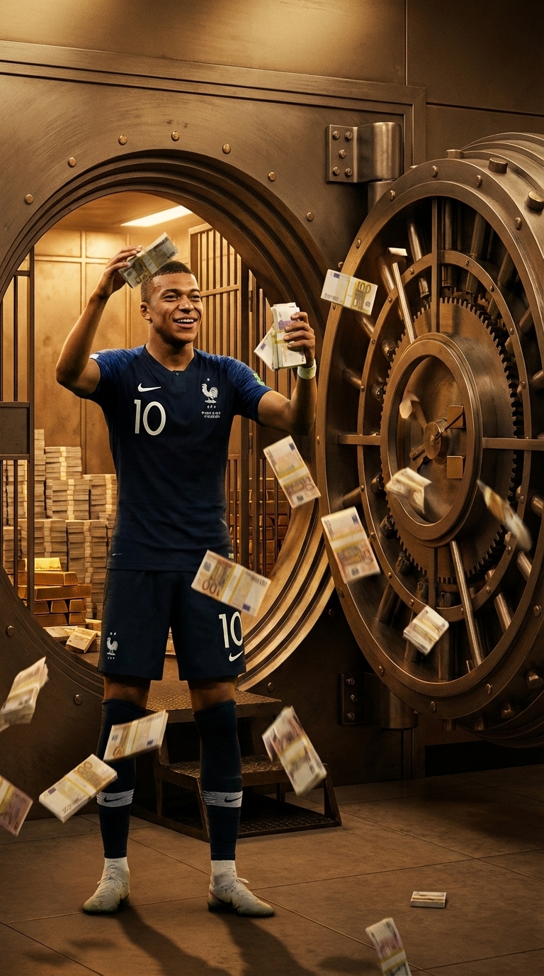 Strong rule: style --- Фотореалистичный, кинематографический стиль, вы... ---. Роскошное банковское хранилище с открытой круглой дверью. Мбаппе стоит посреди комнаты, полной пачек денег, и в восторге подбрасывает их в воздух. Character appearance reference (MUST match exactly): - Килиан Мбаппе: Strong rule: style --- Фотореалистичный, кинематографический стиль, вы... ---. Молодой, атлетичный футболист с уверенным и высокомерным видом. Одет в темно-синюю форму сборной Франции с номером 10.