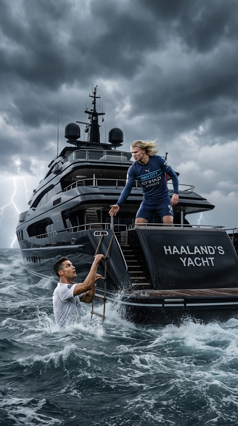 Strong rule: style --- Фотореалистичный, кинематографический стиль, вы... ---. Из штормовых волн появляется огромная черная яхта с надписью 'HAALAND'S YACHT'. Холанд протягивает руку Роналду. Character appearance reference (MUST match exactly): - Криштиану Роналду: Strong rule: style --- Фотореалистичный, кинематографический стиль, вы... ---. Всемирно известный футболист, 30-40 лет, атлетического телосложения, с решительным выражением лица. Одет в белую футбольную форму мадридского 'Реала' с номером 7 на спине. - Эрлинг Холанд: Strong rule: style --- Фотореалистичный, кинематографический стиль, вы... ---. Высокий, мощный футболист с длинными светлыми волосами. Выглядит как викинг. Одет в голубую форму 'Манчестер Сити'.