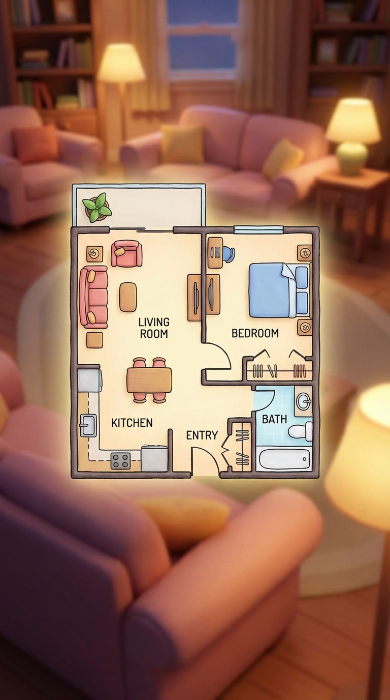 Strong rule: style --- 3D Pixar ---. Стилизованный 2D-план однокомнатной квартиры появляется на размытом фоне гостиной. Планировка четкая и понятная. Эстетика 3D Pixar для фона.