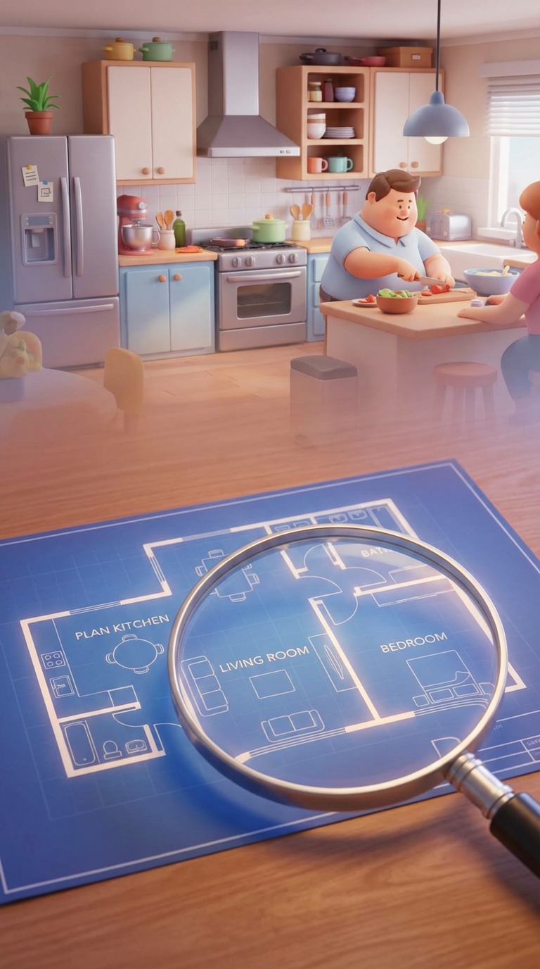Strong rule: style --- 3D Pixar ---. Крупный план плана квартиры, фон меняется на современную кухню. Фокус остается на тексте. Анимированный фон в стиле 3D Pixar.