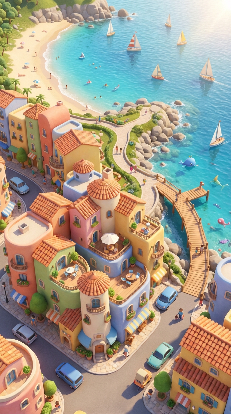 Strong rule: style --- 3D Pixar ---. Вид с воздуха на жилой комплекс, показывающий его близость к красивому синему морю. Береговая линия находится в нескольких минутах ходьбы. Стиль 3D Pixar.