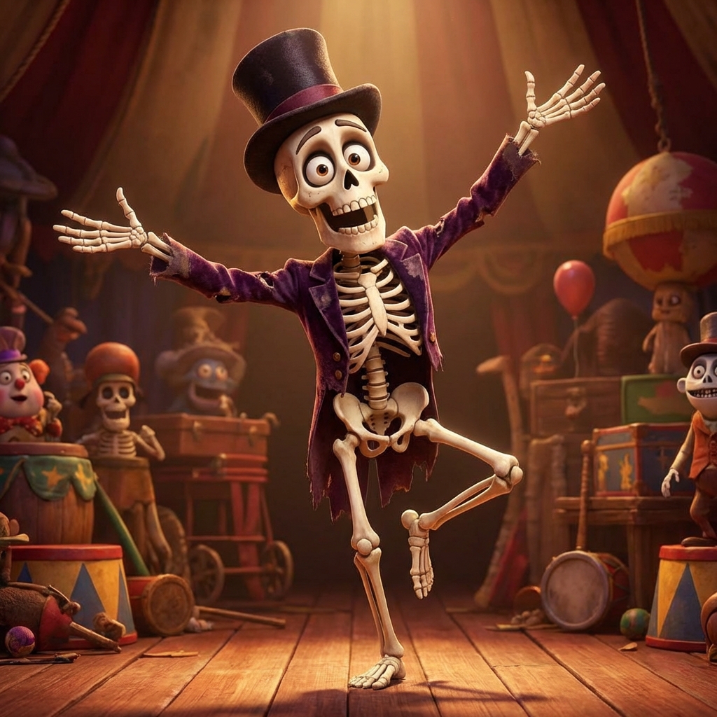 Strong rule: style --- 3D-анимация, Pixar-стиль ---. Мультяшный человеческий скелет с большими, выразительными глазами, способный передавать эмоции через мимику и жесты. В стиле 3D-анимации Pixar.