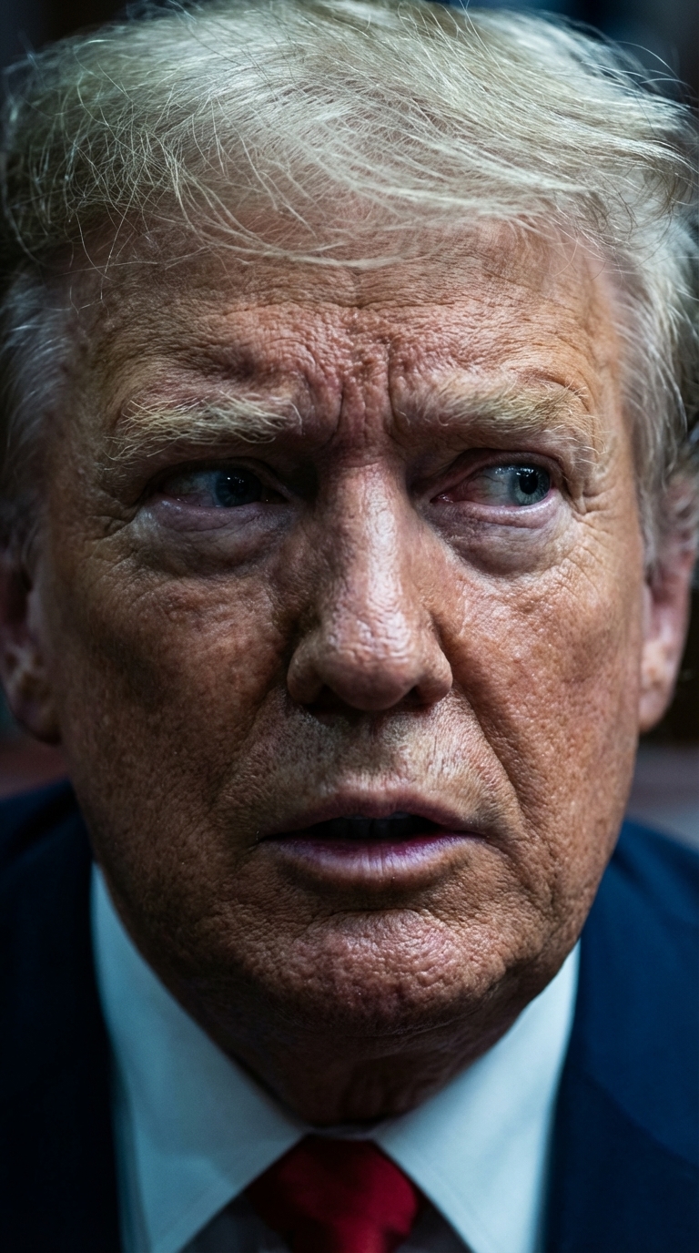 Strong rule: style --- Кинематографичный, ультра-реалистичный, стиль с... ---. Очень крупный план лица Дональда Трампа. Он выглядит взволнованным, глаза бегают. Освещение драматичное, одна сторона лица в тени (Рембрандтовский свет). Фон размыт. Максимальная детализация кожи: поры, морщины. Холодная цветокоррекция. Character appearance reference (MUST match exactly): - Дональд Трамп: Strong rule: style --- Кинематографичный, ультра-реалистичный, стиль с... ---. Мужчина, 78 лет, выглядит как Дональд Трамп. Дорогой костюм, но слегка взъерошенные волосы. Выражение лица обеспокоенное, говорит быстро и эмоционально. Мимика очень живая, на коже видны поры и мелкие морщинки. Снято с использованием кинематографического освещения.
