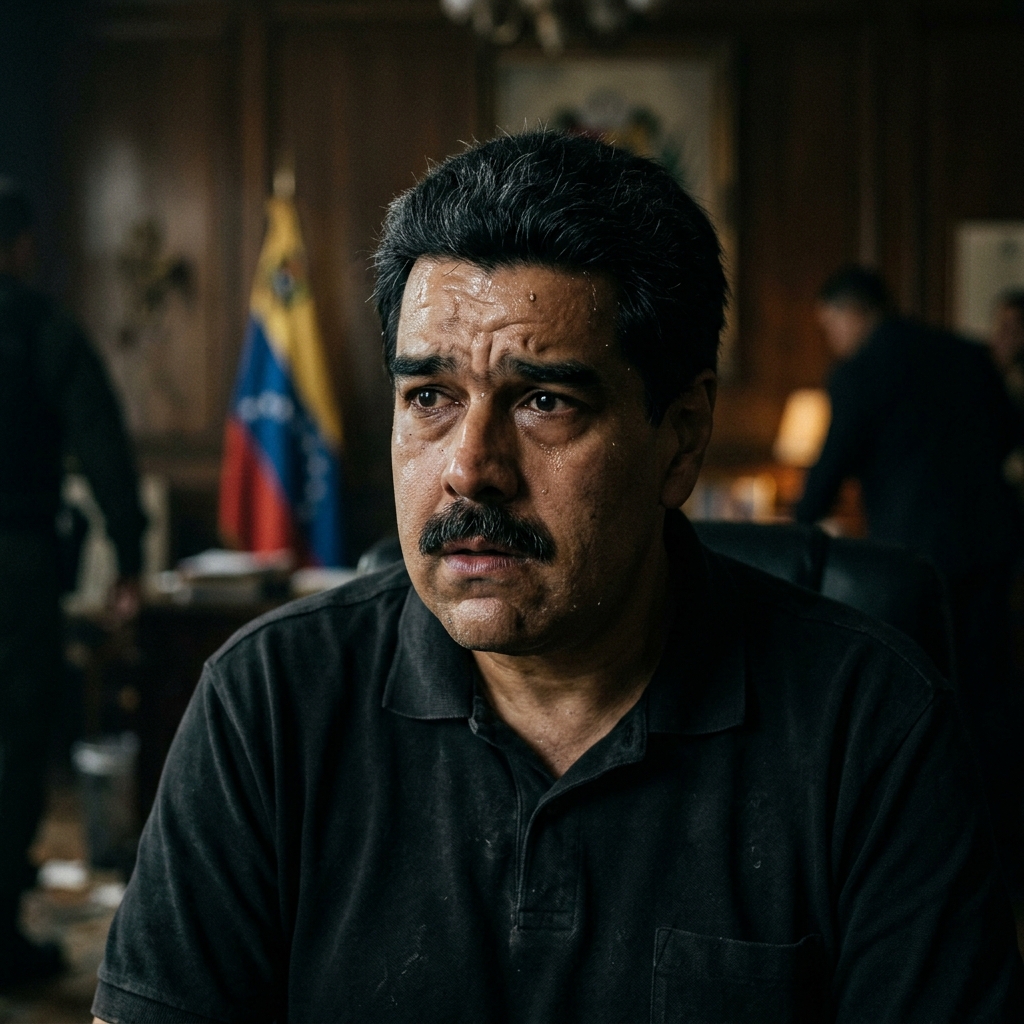 Strong rule: style --- Кинематографический реализм, стиль сериала Netf... ---. Гиперреалистичный портрет Николаса Мадуро, мужчина средних лет, около 60 лет, с характерными усами, слегка взлохмаченными черными волосами. Тревожное, обеспокоенное выражение лица, капли пота на лбу. Одет в простую, немного поношенную темную рубашку-поло. Крупный план, драматическое боковое освещение, глубокие тени.
