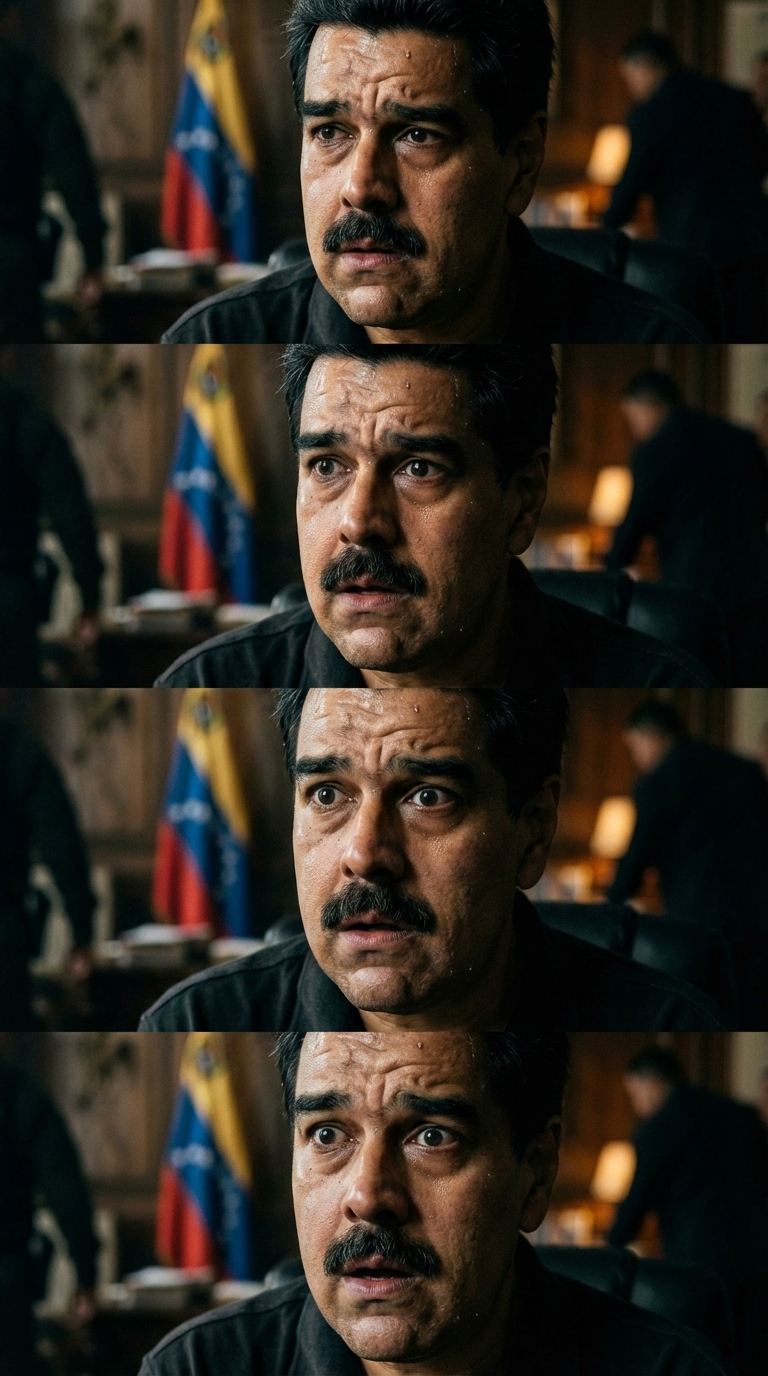 Strong rule: style --- Кинематографический реализм, стиль сериала Netf... ---. Крупный план лица Мадуро. Его выражение меняется с тревоги на искреннее удивление и недоверие. Его глаза слегка расширяются. Character appearance reference (MUST match exactly): - Николас Мадуро: Strong rule: style --- Кинематографический реализм, стиль сериала Netf... ---. Гиперреалистичный портрет Николаса Мадуро, мужчина средних лет, около 60 лет, с характерными усами, слегка взлохмаченными черными волосами. Тревожное, обеспокоенное выражение лица, капли пота на лбу. Одет в простую, немного поношенную темную рубашку-поло. Крупный план, драматическое боковое освещение, глубокие тени.