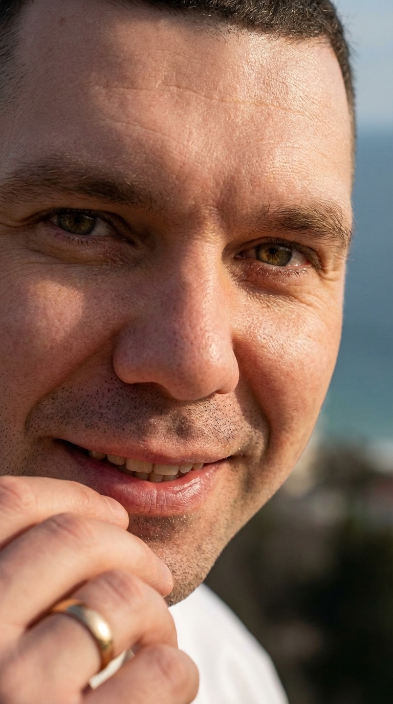 Strong rule: style --- Кинематографический реализм, стиль сериала Netf... ---. Экстремально крупный план улыбающихся губ и уверенных глаз эксперта. Фон — красивый, слегка размытый вид на море. Character appearance reference (MUST match exactly): - Эксперт по недвижимости: Мужчина средних лет, около 35-40 лет, с овальным лицом и светлой кожей. У него короткая стрижка «ёжик» темно-каштанового цвета и светло-карие глаза. Телосложение среднее, спортивное. Он одет в белую куртку-бомбер с синими полосками на рукавах и логотипом футбольной команды «Теннесси Тайтанс» на груди, под которой видна белая футболка. На безымянном пальце левой руки золотое обручальное кольцо, а к куртке прикреплен маленький черный петличный микрофон. Выражение лица спокойное и приветливое, он стоит прямо, жестикулируя правой рукой, словно что-то объясняя.
